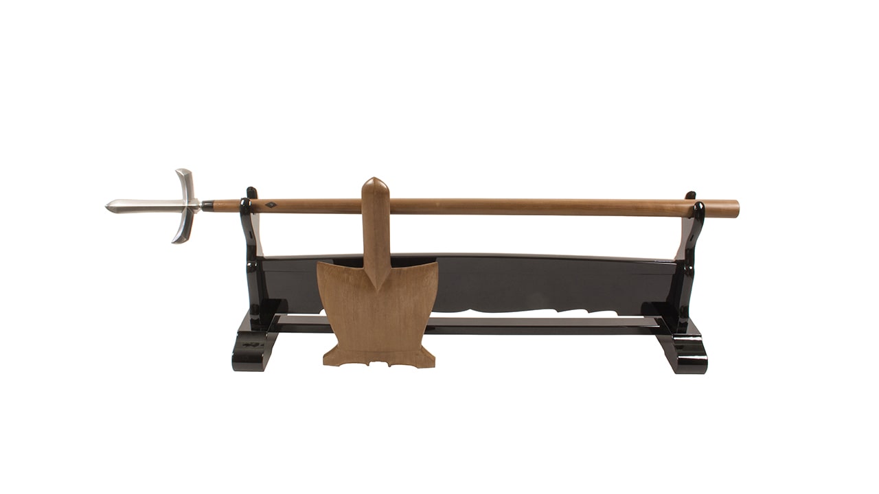 Копьё дзюмондзи-яри, длиной 162 см, мастер Минамото Асин Масамицу. Вид старинного древкового оружия. Острие хо-саки закруглено. Дзюмондзи-яри имеет центральный прямой клинок и два поперечных боковых клинка эда одинаковой длины. Сая — ножны копья, а также древко эбу выполнены из магнолии. В комплекте три чехла. Термин «яри» появился в период Камакура и является общим термином для обозначения японских копий. Наибольшее распространение копьё получает во второй половине периода Муромати (1333 – 1573 гг.), что было связано с междоусобными войнами. В тот период увеличилось значение асигару — пеших воинов низшего ранга, которые были вооружены копьями — яри. Знатный всадник буси носил копьё прикреплённым к правой ноге или стремени с помощью железной или медной опоры для копья яри-атэ. Асигару носили свои копья и копья своих офицеров на плечах. Древки у яри, как правило, были круглыми или многогранными, из дуба или бамбука. Яри снабжалось укрепляющими кольцами сэмэганэ. Иногда к древку копья возле наконечника крепились банты или кисти для впитывания крови с наконечника, которые к тому же дезориентировали противника в бою и служили знаком принадлежности к определённому клану на марше. Верхнюю часть древка лакировали и обматывали шнуром сэн-дан-маки для дополнительной прочности в креплении наконечника. Нижняя часть древка полировалась для того, чтобы исключить скольжение копья в руках воина. Конец древка, как правило, завершался металлическим наконечником – исудзуки, который одновременно являлся и дополнительным поражающим элементом копья, и его балансировочным устройством. Длина копий варьируется. Наиболее длинными копьями (более 6 м) вооружил свою армию Ода Нобунага. До сих пор в синто существует праздник копий — яри-мацури, когда проводятся показательные выступления с различным древковым оружием и соревнования на специальных копьях (сиай-яри), снабженных на конце подушечкой. Cинтоистские священнослужители хорошо владели копьем. Копьё держат двумя руками, применяя различные перехваты, колющие и рубящие удары, удары подтоком исидзуки.