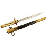 Морской кортик с обточенным фамильным клинком выполнен из стали и имеет нарядное убранство — обтянутую белой кожей ската рукоять, завершенную красивым бронзовым навершием, и лакированные лаком уруси ножны с подвесом. Ножны дополнительно декорированы бронзовыми элементами с гравировкой в виде цветков сакуры. Изделие в хорошей сохранности.