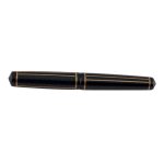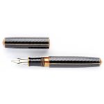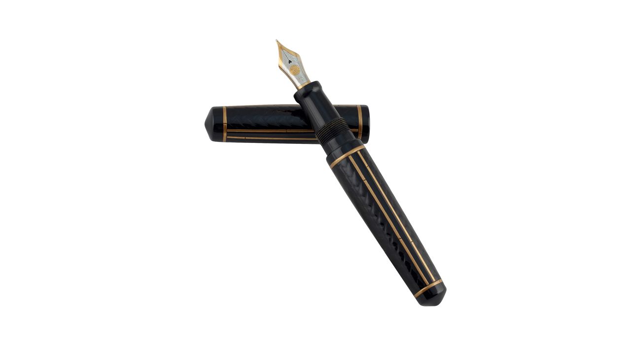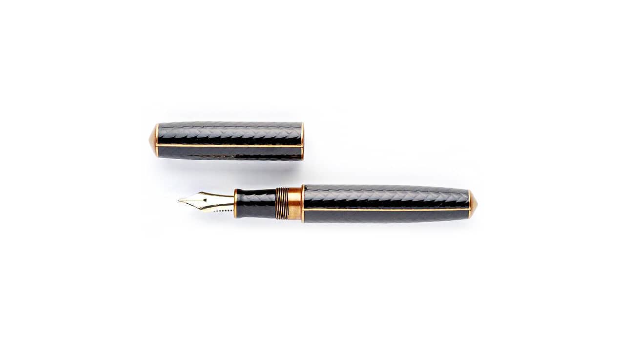Производитель: Nakaya Корпус ручки выполнен в форме сигары из эбонита и покрыт лаком с дизайном адзиро. Адзиро означает технику плетения с использованием бамбука и других материалов. В древние времена эта техника использовалась для изготовления транспортных средств для аристократов и самураев, а также для декора потолка в чайной комнате. Сегодня для изготовления изделий, выполненных в технике Адзиро используется ротанг. Применение плетения очень широко: от чайных сосудов до мебели. Это очень популярный и необычный продукт. В период Эдо имитация Адзиро использовалась для декорирования инро в технике маки-э. Чтобы добиться эффекта Адзиро компания Nakaya использовали каркас из плотно сплетенных полосочек металла (золота и серебра) с последующим нанесением чёрного полированного лака уруси «roiro urushi». Колпачок ручки завершается коническим золотым навершием в технике лакирования маки-э. Металлические детали выполнены из золота и серебра. Перо выполнено из золота и имеет каноническую гравировку компании Nakata (фамилия основателя компании) в орнаментальном обрамлении. Несмотря на отсутствие дополнительного декора, изделие выглядит дорого и элегантно благодаря использованию высоких технологий и ценных материалов. Считается шедевром работы по лаку.