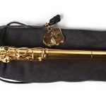 Ручка выполнена из желтого металла. Колпачок изготовлен методом художественного литья с ручной доработкой. Композиция колпачка из струящихся брызг завершается декоративной скульптурой (зажимом) девушки-эльфа, как будто вылетевшей из воды и застывшей в воздухе. Выполнена в стиле модерн. Перо ручки изготовлено из желтого металла и имеет гравировку с изображением женского силуэта-эльфа. В комплекте затягивающийся кожаный чехол.