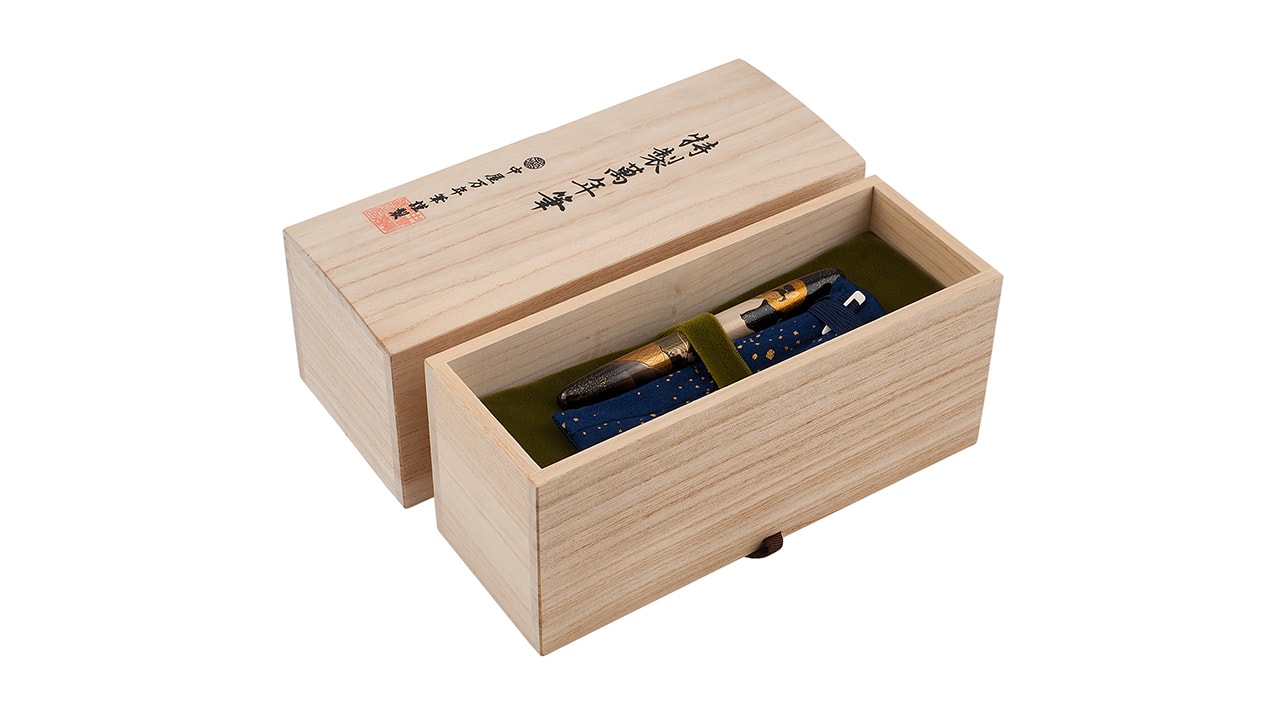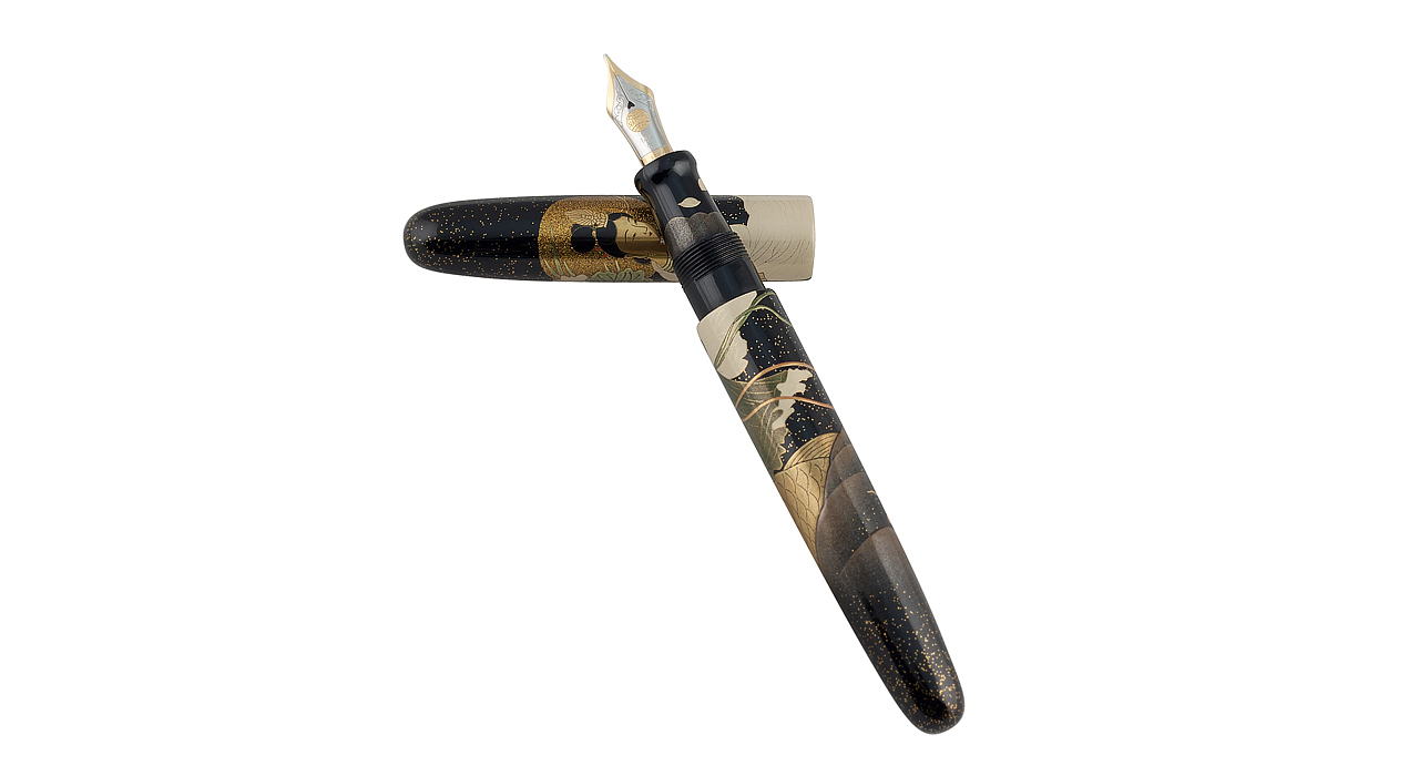Ручка-сигара выполнена из эбонита и покрыта лаком уруси с декором в технике маки-э. Производитель — компания Nakaya. Перо ручки выполнено из золота 14K с нанесением клейма Nakata (фамилия основателя компании). Сюжет на ручке — фрагмент репродукции картины известного художника Каванабэ Кёсай (Эдо — начало Мэйдзи). Картина на ширме известна под названием «Скользящие по волнам богини Каннон». Для детализации изображения использовались сложные техники – «какивари маки-э», «харигаки», «сисиай тогидаси маки-э». В технике «какивари макиэ» изображены украшения для волос богинь. Суть техники заключается в окрашивании фона вокруг заданных линий, чем достигается эффект объемности изображения. Цветочная ваза и рыба оформлены по технике «харигаки» («писать иглой»). Волны, окружающие рыбу, на которой стоит богиня, изображены в технике «сисиай тогидаси макиэ», смысл которой заключается в получении объемной картинки за счет накладывания на поверхность несколько слоев лака и различных материалов (золота, серебра).