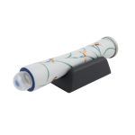 Калейдоскоп масляного типа с красивой витражной поверхностью. На одной стороне имеется яркая накладка из стекла, придающая особый шарм изделию, на другой стороне – переливающийся витраж в пастельных тонах. Авангардный стиль делает калейдоскоп настоящим произведением искусства. Для того, чтобы проецировать изображение необходимо одной рукой держать калейдоскоп, а другой рукой вращать круглый длинный барабан, сдвигая его слегка влево и вправо. Таким образом проецируемая внутри барабана картинка будет меняться. На калейдоскопе имеется клеймо мастера Кодзи Ямами.