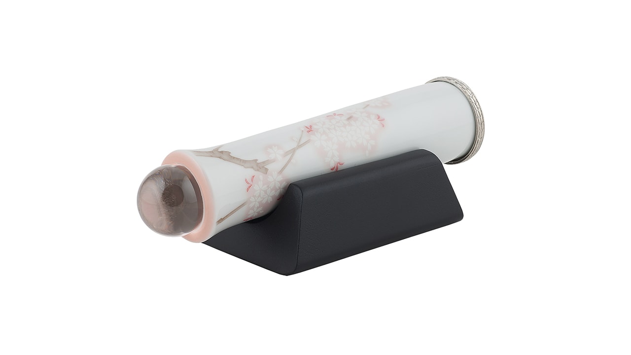 В переводе с греческого калейдоскоп означает «смотрю на красивый вид». Изящное изделие из керамики и в лучших традициях школы Арита. Мастерская хранит старинные традиции изготовления керамических изделий. Калейдоскопы не стали исключением и выполнены по всем канонам японского керамического искусства. Корпус выполнен из керамики и стекла и украшен изящным и нежным изображением японской вишни — сакуры. Японская сакура — известный символ Японии и японской культуры. Цветение сакуры считается национальным событием. Розовый цвет в Японии, а также в Корее и Китае — символ праздника весны, пробуждения природы, начала жизни. Кроме того, японская сакура — традиционный символ женской молодости и красоты.