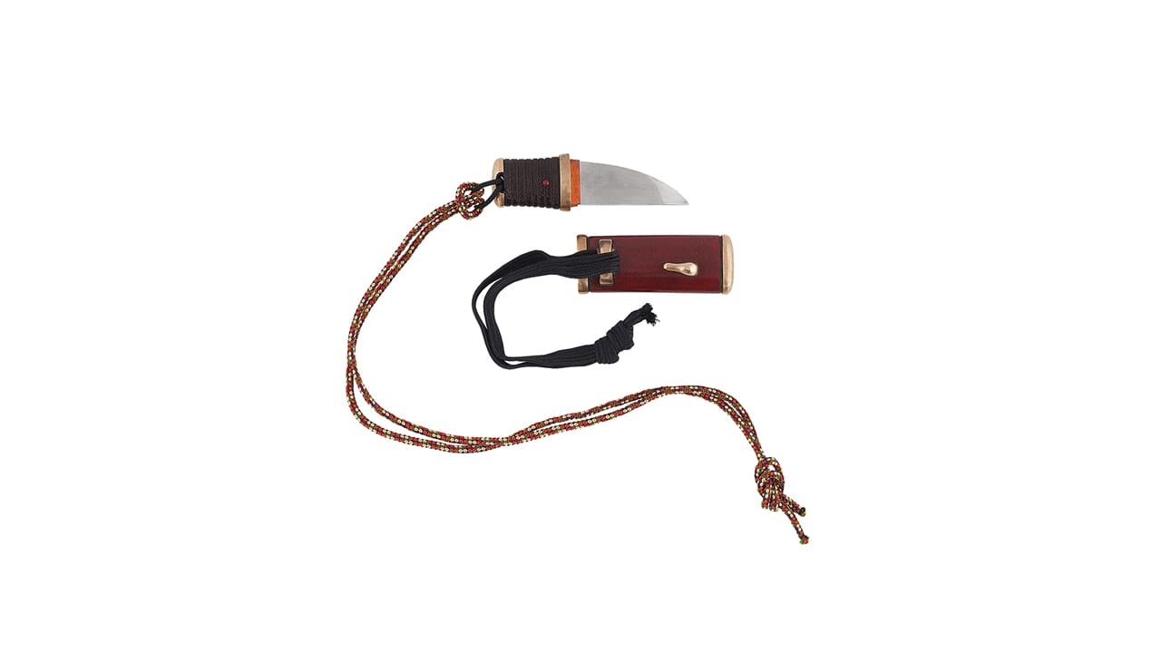 Артикул: NIBE27-18 Авторский коллекционный универсальный фиксированный нож мастера ножевого дела NibeYukio. Миниатюрный клинок классической универсальной формы конца капли воды имеет сечение плоского клина с подводом и двустороннюю заточку. В качестве заготовки клинка использовалась сталь антикварного меча. Клинок изготовлен мастером вручную из японской инструментальной стали SKD11, характеризующейся высокими режущими свойствами и прочностью по Роквеллу 58-62 HRC. Сочетает в себе технологичность, прочность, хорошие режущие свойства и отлично правится. Поверхность клинка доведена до идеального зеркального блеска. Эргономичная рукоятка овального сечения вырезана мастером из натуральной древесины магнолии. На поверхность нанесены поперечные углубления, создающие эффект обмотки на рукояти. Дерево пропитано натуральным лаком уруси. На хвостовике – декоративная бронзовая заглушка с петлёй для крепления шнура. Отполированный бронзовый больстер выполнен в форме опоясывающего кольца. Небольшая гарда выполнена так же из полированной бронзы и имеет форму овальной цубы. Деревянные ножны овальной формы имеют полированную бронзовую фурнитуру. Поверхность обработана натуральным лаком уруси, добавляя глубину натуральному цвету древесины.