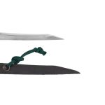 Клинок выполнен из клинка антикварной катаны (тамахаганэ). Сталь тамахаганэ – уникальный сплав ручного производства по традиционной японской технологии, с неоднородным содержанием углерода. Благодаря своему составу имеет различную степень твёрдости. Вследствие неоднородности структуры имеет неповторимый рисунок и великолепно поглощает удары подобно мечу самураев.
