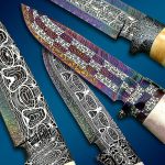 Размеры: Длина общая -195 мм, длина клинка — 80 мм, толщина клинка — 3 мм, ширина клинка – 26 мм Повседневный складной нож. Клинок выполнен из высокоуглеродистой коррозионностойкой стали VG – 10, прочность 60 HRC. Клинок имеет классическую форму пятигранного сечения. На зеркально полированной поверхности выполнена ручная гравировка с изображением мифического существа-демона «Они». Инкрустирован золотом 999 пробы (24К). Клеймо мастера расположено на флиппере клинка. Ручка ножа монолитная, изготовлена из кости мамонта. Поверхность искусственно состарена, инкрустирована золотом. Накладка ручки выполнена из серебра 950 пробы, чернение. На поверхности накладки нанесена ручная гравировка с изображением дракона и демона, инкрустация золотом. Сюжет гравировки на лезвии: демон Они. Они — злые рогатые человекоподобные демоны, живущие в Аду (Дзигоку). В бою используют железную палицу с шипами (канабо). Носят набедренную повязку из тигровой шкуры. Они хитры и умны, могут превращаться в людей. Люди, не контролирующие свой гнев, могут превратиться в они. Особенно это относится к женщинам. Иногда бывают добры к людям и служат их защитниками. Сюжет гравировки на рукояти — японский дракон.
