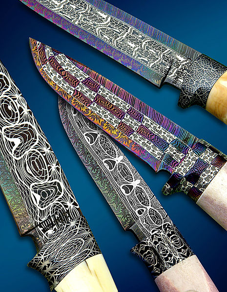 Клинок выполнен из высокоуглеродистой коррозионностойкой стали VG – 10, прочность 60 HRC. Клинок имеет классическую форму пятигранного сечения. На зеркально полированной поверхности выполнена ручная гравировка с изображением мифического существа-демона «Они». Инкрустирован золотом 999 пробы (24К). Клеймо мастера расположено на флиппере клинка. Ручка ножа монолитная, изготовлена