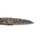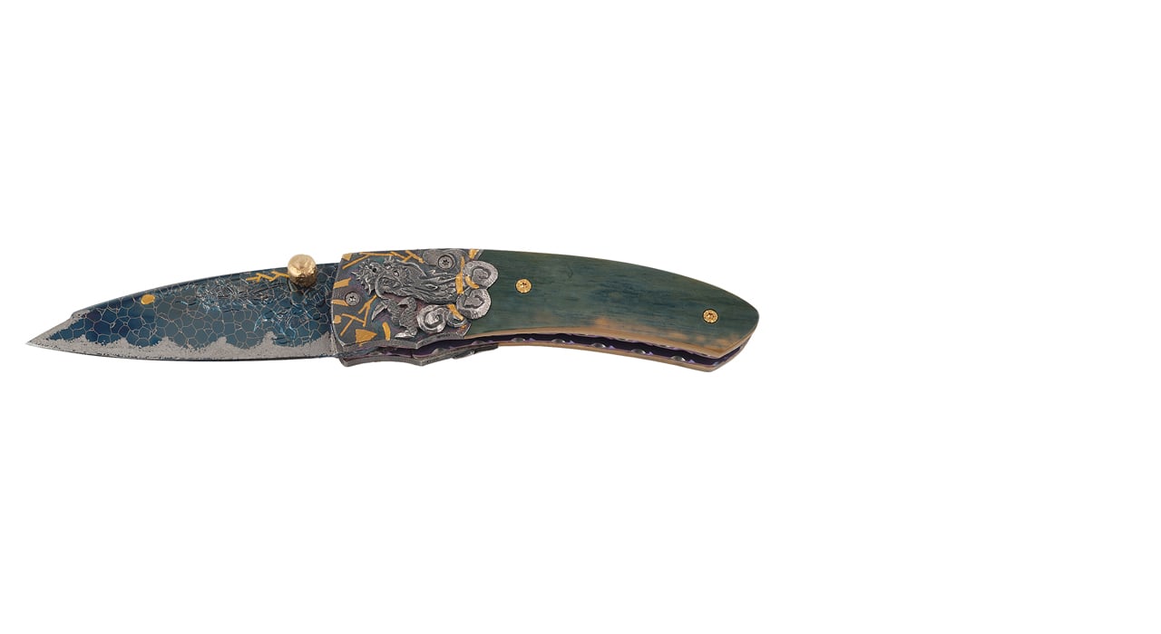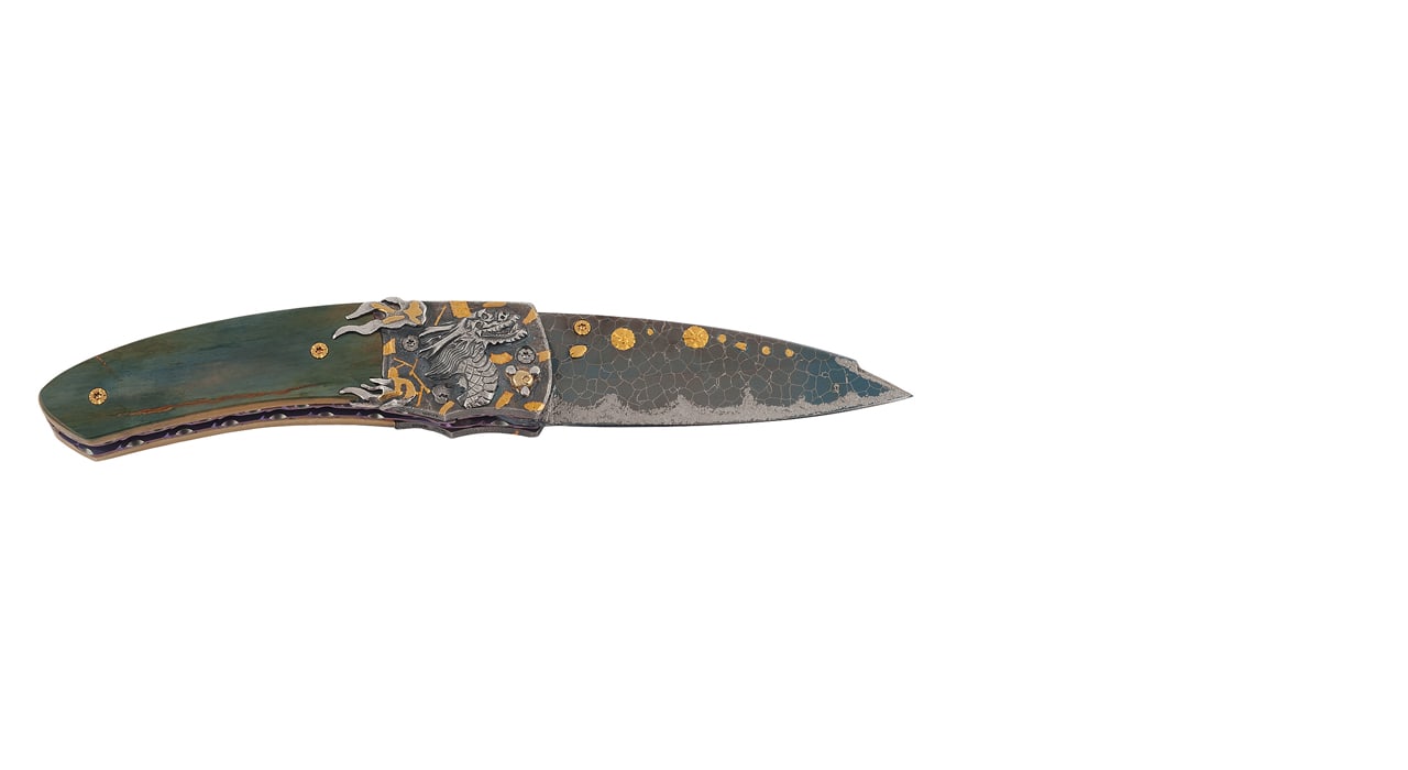 Авторский коллекционный складной универсальный нож с ручным открыванием и закрыванием клинка выполнен мастером Гленном Уотерсом. Нож имеет целостную композицию. Центральным мотивом изображения являются драконы. Основной массив композиции приходится на рукоять, в которую инкрустированы гравированные детали – головы драконов, затем композиция продолжается на клинке легкой гравировкой. Дракон как персонаж японской мифологии и фольклора существует в японской традиции в двух плоскостях: с одной стороны, он одна из ипостасей божества воды, а с другой — самостоятельное, очень почитаемое божество, играющее в японской культуре огромную роль. Драконы Дальнего Востока считались существами высокого небесного происхождения. Драконы повелевали всей водной стихией – от морской пучины до облачных высот. Они управляли разливами рек и дождевыми тучами, горными водопадами и озерами. Дракон является одним из символов императорской власти. Открывание происходит с помощью нажатия на клинок, отработанная система механизмов позволяет обнажить клинок одним движением большого пальца руки. Прямой, с небольшим скосом, клинок классической формы Drop point выполнен из кованого мозаичного дамаска, с оригинальным ячеистым орнаментом, напоминающим чешую дракона. Дополнительная термообработка с отпуском в масло создаёт на поверхности клинка защитную пленку чёрного цвета. На левой поверхности клинка нанесена ручная гравировка, изображающая затаившегося в горных облаках дракона. Мы можем увидеть его голову, часть чешуистого тела и когтистые лапы. С обеих сторон клинок декорирован инкрустацией золотом высочайшей пробы в 18k и 24k. Шпенёк открывания выполнен из золота 999 пробы. Режущая кромка обработана химическим травлением, что выявляет зернистую структуру металла, гармонично сочетаясь с мозаикой дамаска. Больстер выполнен из титанового сплава с декором в виде гравировки и инкрустации золотом 24k. Рисунок больстера — это продолжение общей темы дракона. Затаившийся дракон в завитках облаков выполнен путём глубокой ручной гравировки. Чёткая граница клинка и рукояти отсутствует благодаря резному краю больстера, пролегающего по границе рисунка гравировки. Рукоять выполнена в виде резных плашек из ископаемого бивня мамонта, закреплённых на декоративных винтах. Спинка ножа украшена орнаментом «filework» – ручной резьбой по металлу.