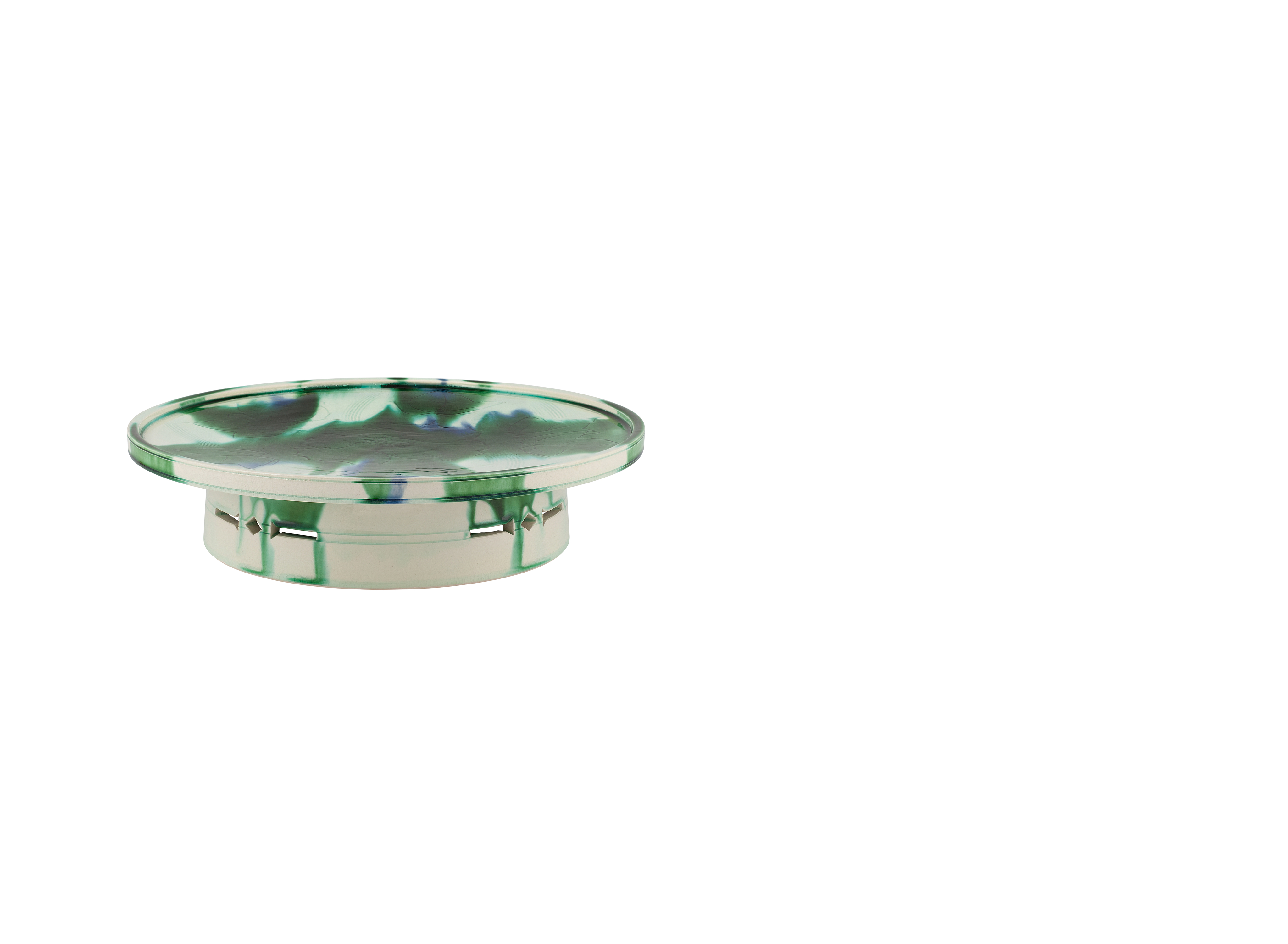 Като Кобэй VII — современный японский мастер-керамист в седьмом поколении династии. В настоящее время возглавляет производство керамики печи Кобэй. Мастер занимается сохранением наследия своей семьи, и главным образом открытий, совершенных его отцом, Като Такуо. Декоративное блюдо выполнено в технике трехцветного глазурования и представляет собой яркий пример экспрессивного стиля Като Кобэй VII. Текучие изумрудно-зеленая и индиго-синяя глазури иллюзорно сливаются воедино, образуя на белой фарфоровой поверхности пятиконечную форму, в которой просматривается рельефное изображение цветка.