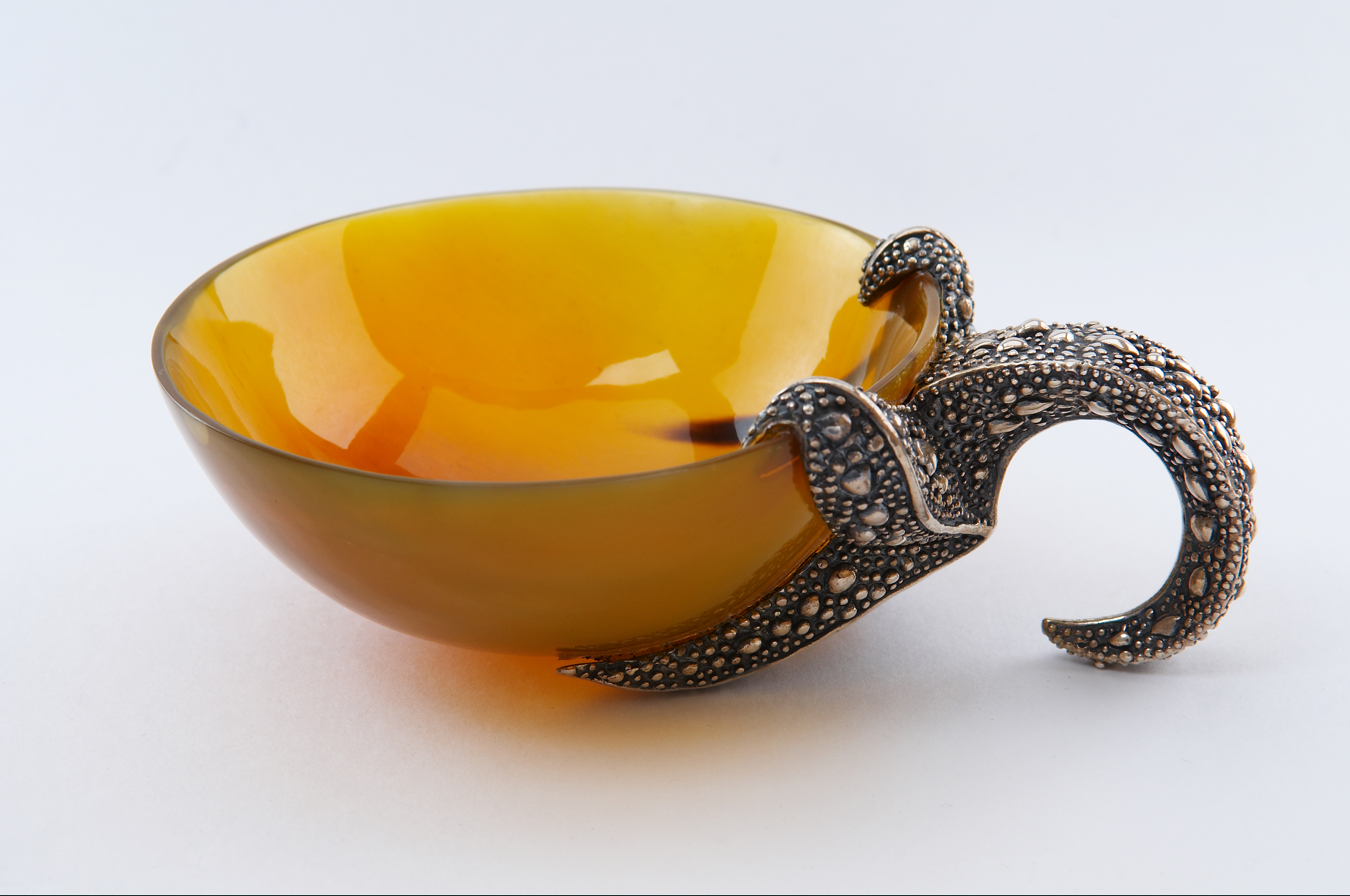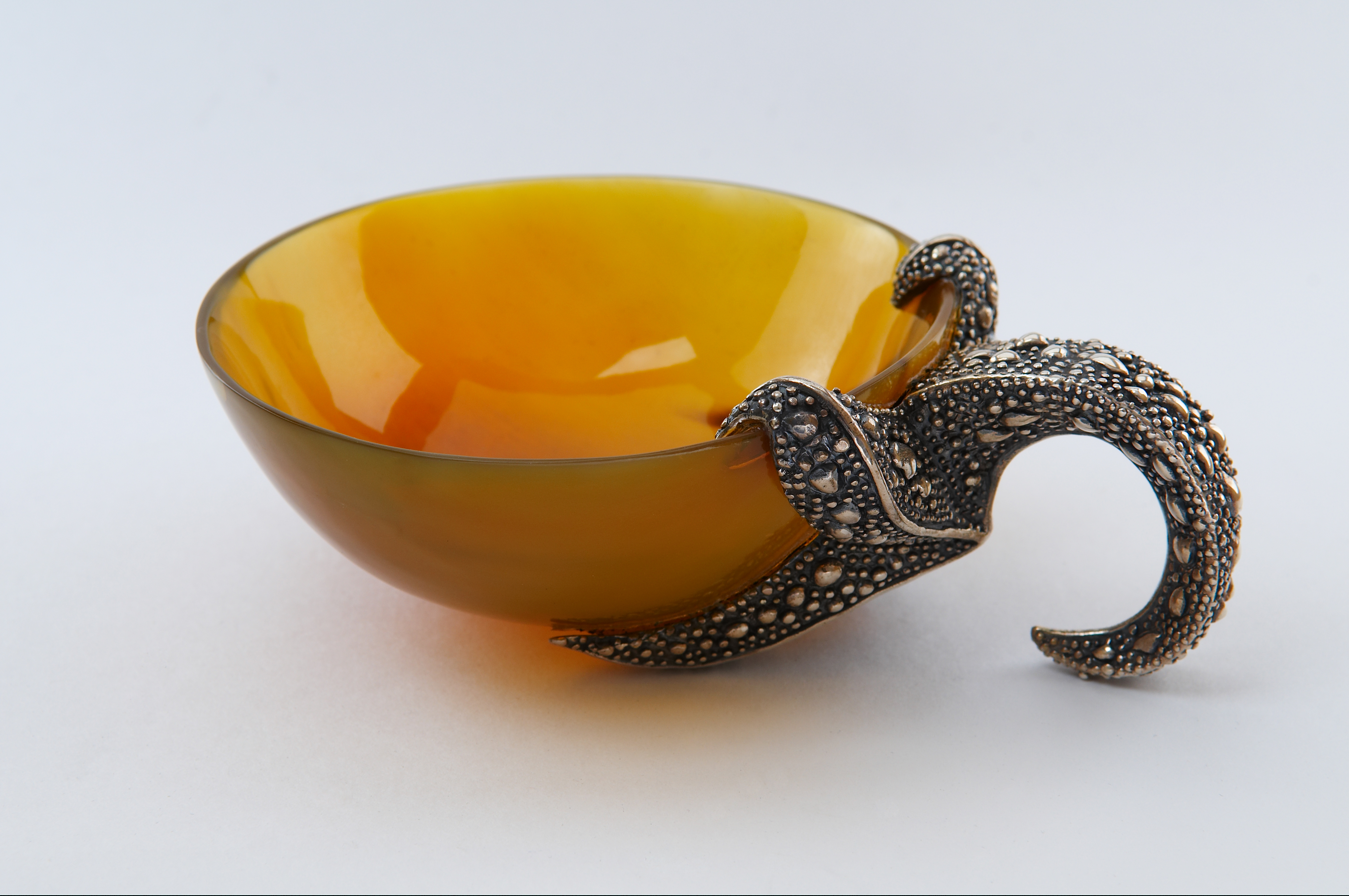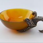Декоративное блюдо состоит из чаши и оригинальной боковой опоры в виде морской звезды. Блюдо можно использовать для декора интерьера, сервировки стола и хранения мелких ценных вещей. Чаша блюда выполнена из рога буйвола, обладает насыщенным янтарным цветом и идеально гладкими отполированными поверхностями. Основа притяжения этой композиции — фигура морской звезды, которая как будто цепко ухватилась за край блюда — половинку фантазийного кокоса. Мастер удивительно реалистично изобразил фактуру кожи морского обитателя, создав «бугристую» поверхность, а также пластичность формы этого животного. Искусство тайских мастеров в обработке металлов славится на весь мир и позволяет им создавать настоящие шедевры из этого непростого в обработке материала. Умельцы этой солнечной страны веками оттачивали свои навыки, создавая из серебра шкатулки, вазы, столовые приборы, предметы декора, которые поражают своим высочайшим качеством и красотой.