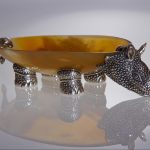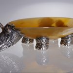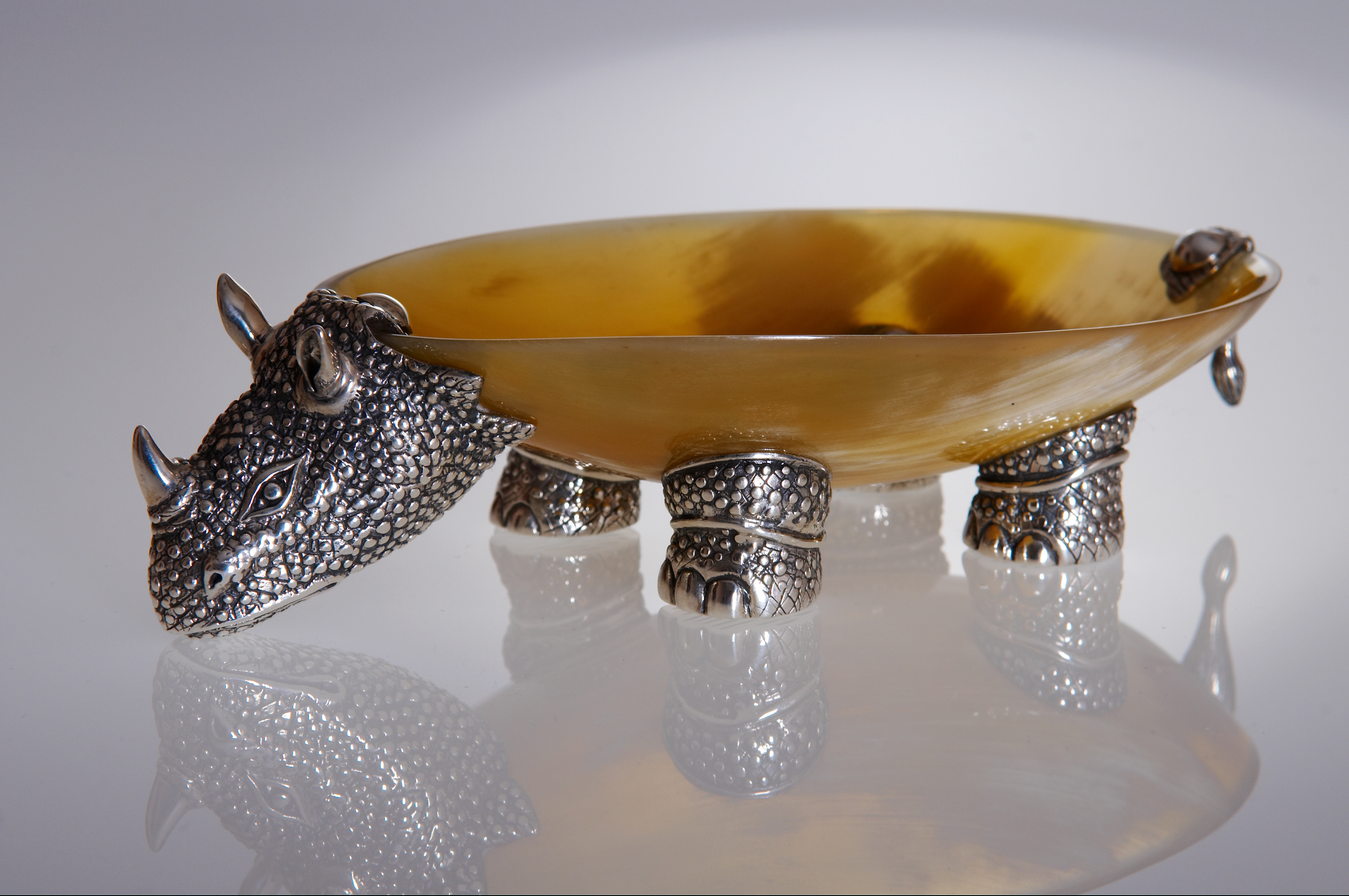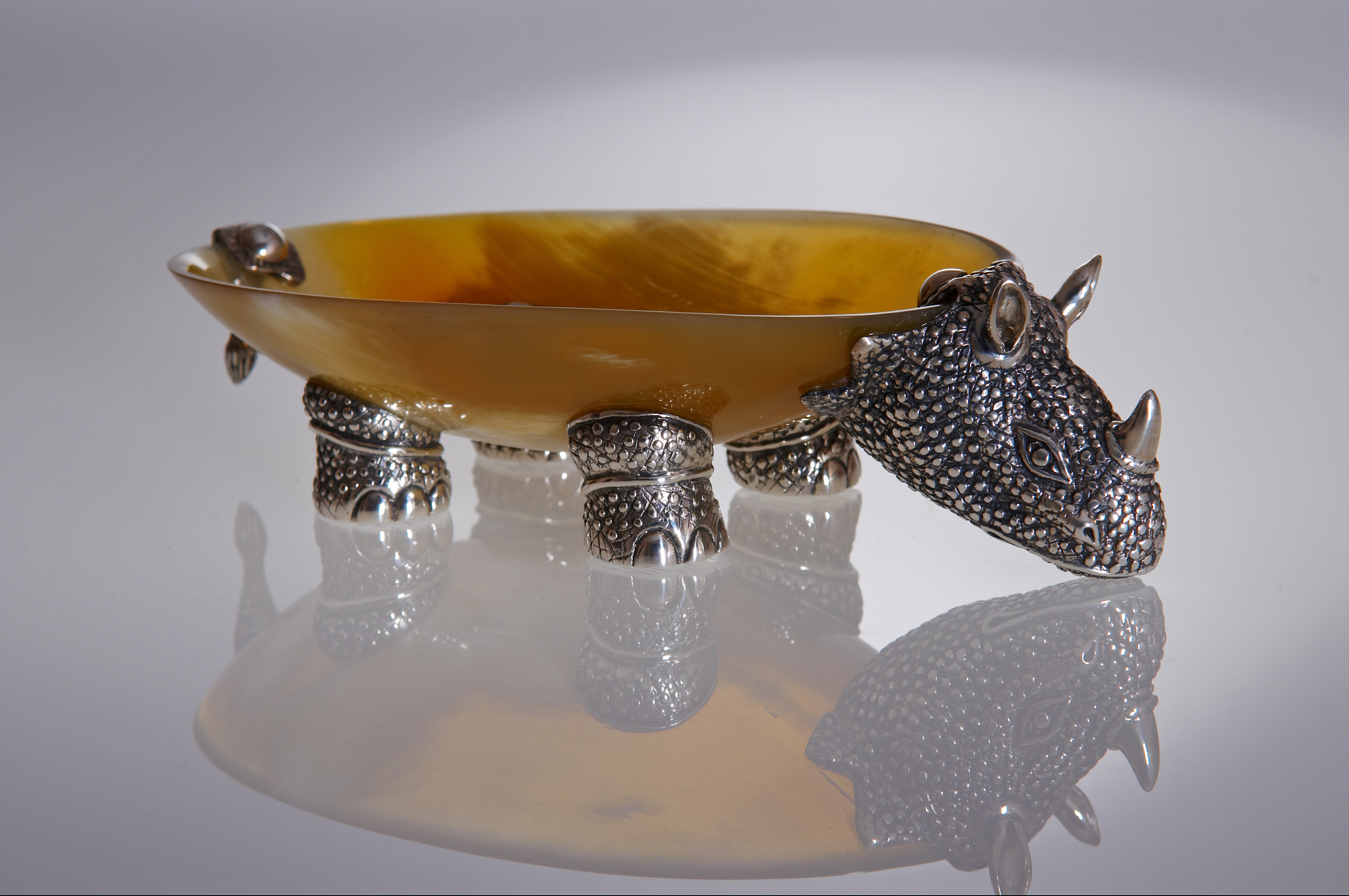 Декоративное блюдо изображает одного из обитателей африканской саванны — носорога, представляет собой чашу на фигурных ножках. Блюдо можно использовать для хранения мелких ценных вещей или для декора интерьера, оно станет ярким его акцентом. Чаша блюда с невысокими бортиками выполнена из рога буйвола в технике резьбы, обладает притягательным насыщенным цветом янтаря. Чаша, по замыслу мастера, становится «туловищем» фантазийного носорога. Из серебра выполнены голова и ноги животного, при этом мастер искусно обработал его поверхность, создав рельефную фактуру кожной поверхности носорога, натуралистичные трещины и даже ногтевые пластины. Искусство тайских мастеров в обработке металлов славится на весь мир и позволяет им создавать настоящие шедевры из этого непростого в обработке материала. Умельцы этой солнечной страны веками оттачивали свои навыки, создавая из серебра шкатулки, вазы, столовые приборы, предметы декора, которые поражают своим высочайшим качеством и красотой.