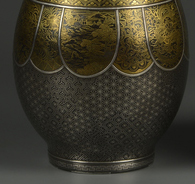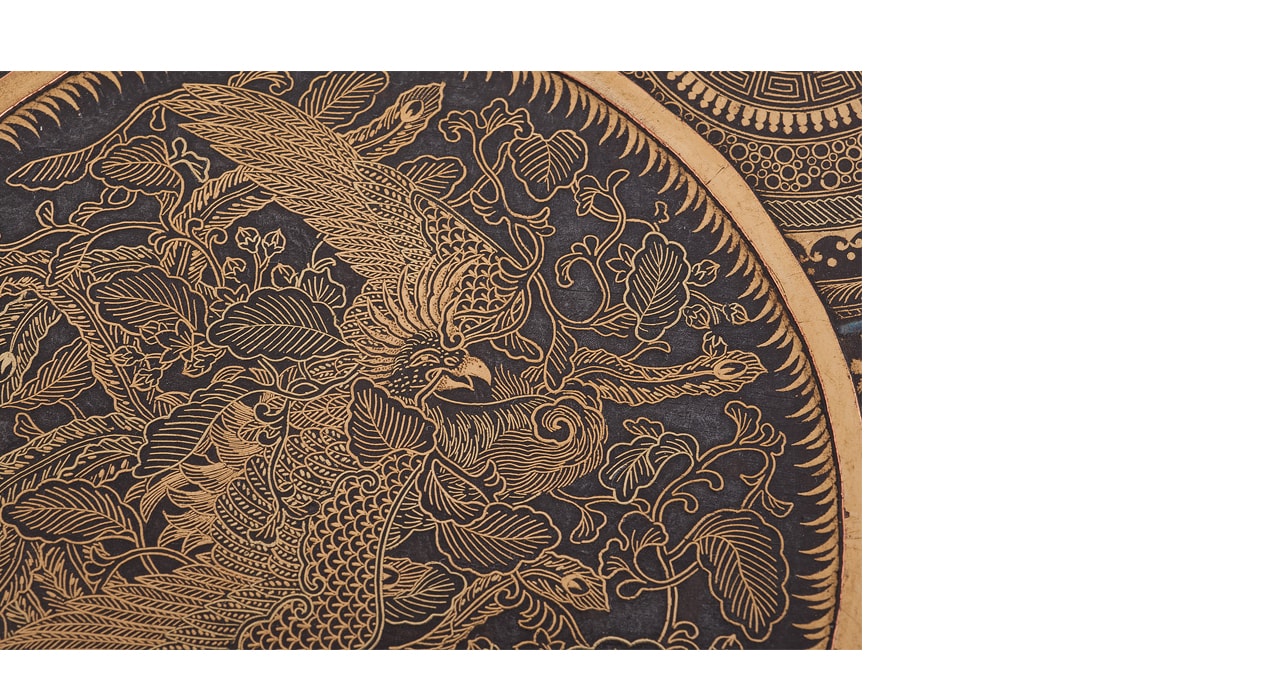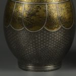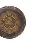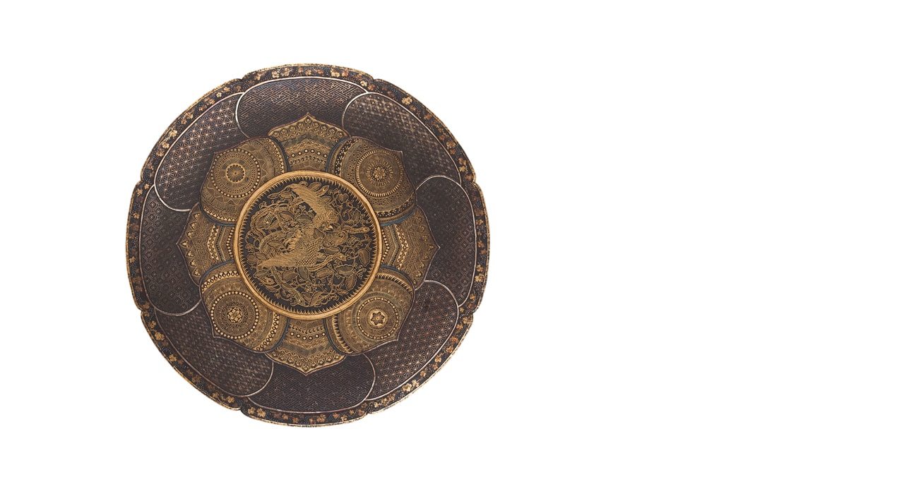 Мастерская Комаи достигла своего расцвета в 1877 году, создавая произведения декоративно-прикладного искусства в основном из металла, инкрустированные золотом и серебром в технике нуномэ-дзоган (дамаскирование). Блюдо выполнено в технике инкрустации нуномэ-дзоган. Эта техника, происходящая из Китая, была распространена во многих странах Востока. В Японии она традиционно использовалась в декоре оправы мечей – цуба и косираэ и в создании небольших предметов, таких как шкатулки или металлические гребни и шпильки для волос. В качестве базового металла используются сплавы сибуити и сякудо, а также медь и серебряные сплавы. Инкрустация часто выполняется золотом, серебром или сплавами с высоким содержанием благородных металлов. Блюдо отличается тонкой работой, изящным орнаментальным рисунком и сложной композицией с богатой палитрой использованных металлов. На зеркале блюда в круглом поле изображён феникс (птица Хоо) в обрамлении пышных растений. Борта оформлены геометрическим орнаментом в полях, напоминающих лепестки лотоса и листья, по краю чуть фестончатого борта композицию обрамляет полоса растительного орнамента (виноградная лоза). На основании имеется клеймо мастерской «Нихон коку. Кё̄тодзю̄ Комаисэй» — «Япония. Сделано в мастерской Комаи в Киото». Мастерская Комаи, известная производством оправ для мечей, была основана в 1841 году мастером Комаи Сэйбэй, и подлинного расцвета достигла во время работы Комаи Отодзиро (1842-1917). Технике инкрустации Комаи Отодзиро обучался у знаменитого мастера Мисаки Сюсукэ из провинции Хиго (сейчас — Кумамото), до 1876 года (выхода запрета на производство мечей) создавал детали монтировки холодного оружия в технике нуномэ-дзоган. Однако уже в 1873 году мастер начал производство декоративных изделий в такой же технике, в основном – для экспортной торговли. Работы Комаи Отодзиро были высоко оценены как в самой Японии, так и за рубежом: в 1885 году в Нюрнберге на Всемирной выставке художественных работ по металлу работы мастера в составе представительной японский делегации (почти 500 предметов) завоевали гран-при. Также работы мастерской выставлялись в Японии, в Санкт-Петербурге, Сиэтле, Брюсселе, Лондоне и Вене. Сын Отодзиро – Сэйбэй (1883-1970, Отодзиро II), принял руководство мастерской в 1906 году, однако Комаи Отодзиро продолжал работать до самой смерти, сосредоточившись на выставочных изделиях большой трудоёмкости, сложных форм и изысканного декора. Работы Комаи Отодзиро хранятся в крупнейших музеях мира – Музее Виктории и Альберта (Лондон), Музее Метрополитен (Нью-Йорк) и др. Блюдо обладает высокой художественной ценностью, представляет собой коллекционную и музейную редкость.