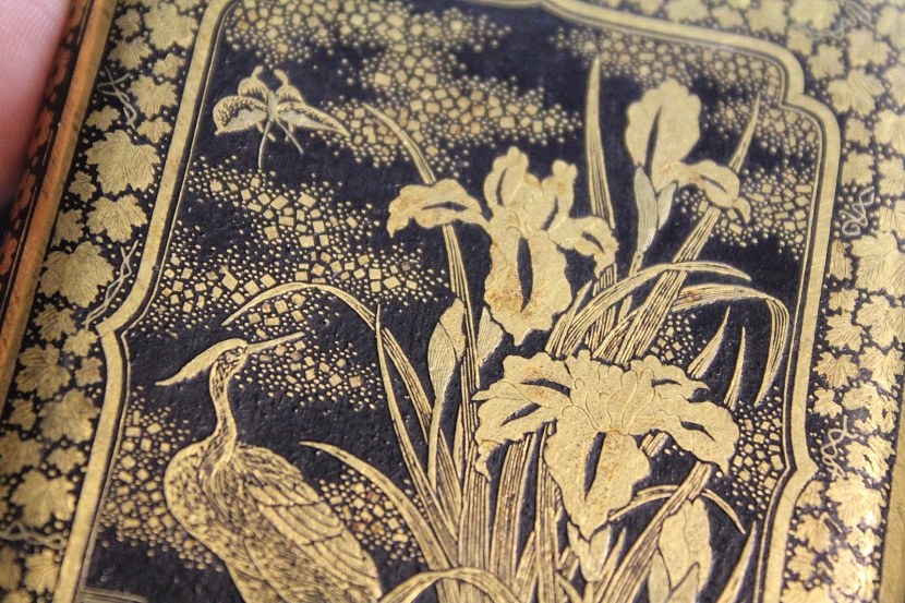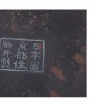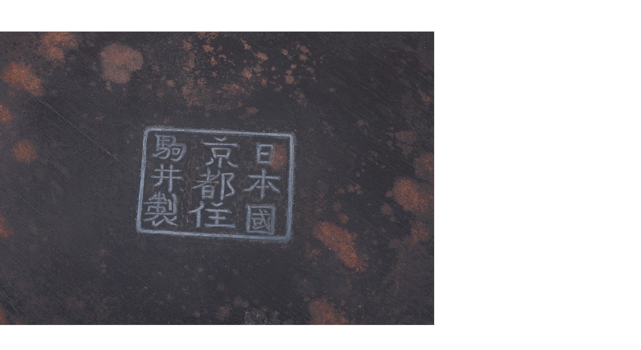 На основании имеется клеймо мастерской «Нихон коку. Кё̄тодзю̄ Комаисэй» — «Япония. Сделано в мастерской Комаи в Киото». Мастерская Комаи, известная производством оправ для мечей, была основана в 1841 году мастером Комаи Сэйбэй, и подлинного расцвета достигла во время работы Комаи Отодзиро (1842-1917). Технике инкрустации Комаи Отодзиро обучался у знаменитого мастера Мисаки Сюсукэ из провинции Хиго (сейчас — Кумамото), до 1876 года (выхода запрета на производство мечей) создавал детали монтировки холодного оружия в технике нуномэ-дзоган. Однако уже в 1873 году мастер начал производство декоративных изделий в такой же технике, в основном – для экспортной торговли.