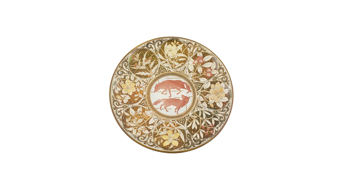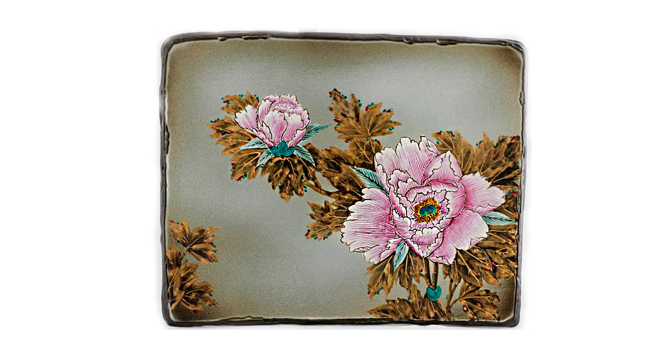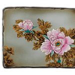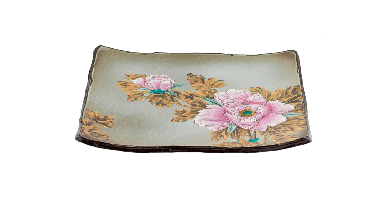 Декоративное плоское блюдо прямоугольной формы выполнено из керамики Кутани. Изделие богато декорировано эмалевидными красками и золотом. Основной мотив декора — цветы розового пиона. На основном сером фоне рельефно выполнены лепестков цветов, нежность и хрупкость пиона переданы с помощью мягкого перехода цвета от яркого розового к светлому, почти белому. Цветы особенно эффектно смотрятся на фоне приглушенных желтовато-коричневых листьев с золотыми прожилками. В Японии пион — символ свадьбы, плодовитости, весны, славы, богатства, успеха и радости. Свое европейское название пион получил от имени врачевателя олимпийских богов Пеона (или Пиона), означающего «дарующий свет». Кутани – уникальное место, расположенное в долине девяти гор. Это всемирно известный центр японского керамического искусства, где живут и творят выдающиеся мастера. Самые искусные из них владеют традиционными стилями Кутани, такими как: Ко-Кутани, Ёсида-я.