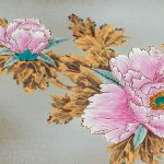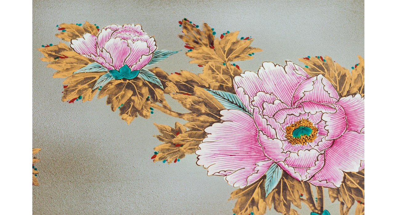 Основной мотив декора — цветы розового пиона. На основном сером фоне рельефно выполнены лепестков цветов, нежность и хрупкость пиона переданы с помощью мягкого перехода цвета от яркого розового к светлому, почти белому.