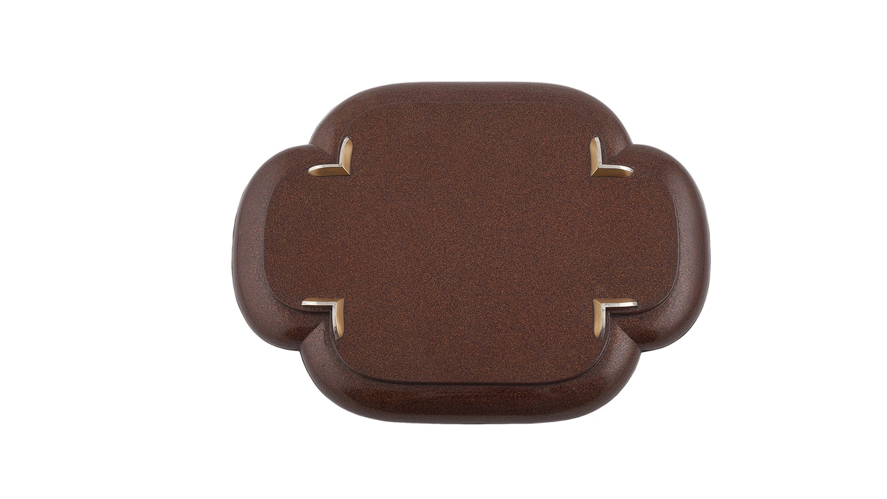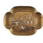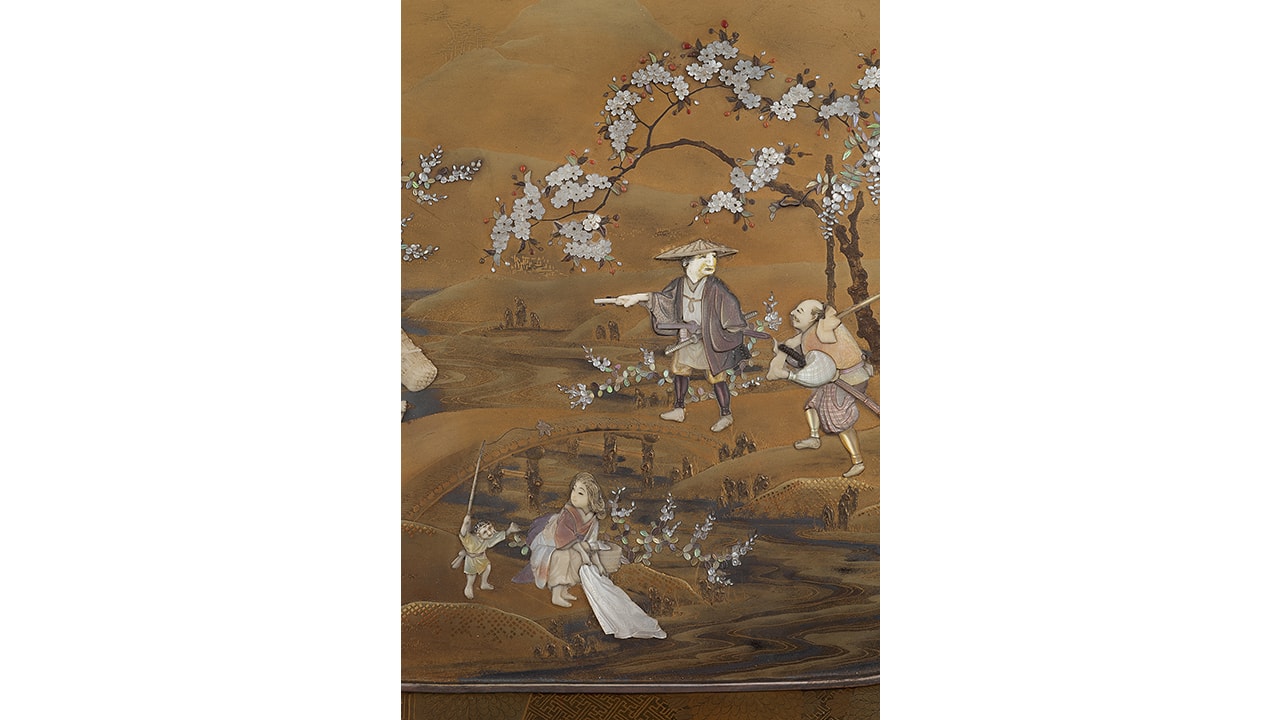 Декоративный поднос выполнен из дерева и покрыт лаком: декор отличается ювелирной детализацией, изысканным подбором цветов и материалов. Сибаяма – вид декора лаковых изделий, названный по названию г. Сибаяма в префектуре Тиба, где такой способ декора появился в эпоху Мэйдзи в мастерской Оноги Сэндзо. Название «Сибяама» возникло в период 1772-1781 года. Экспортный стиль Сибаяма предполагает инкрустацию изделий из дерева, металла и керамики такими редкими и дорогостоящими для Японии материалами, как слоновая кость, перламутр, коралл, черепаховый панцирь; с высоким рельефом с фонами в технике художественного лака. Изделия Сибаяма активно экспортировались на Запад, но такого рода трудоёмкие техники ушли вместе с эпохой Мэйдзи (1868-1912); сейчас осталось очень малое количество мастеров и предметов, выполненных в подобной технике. Редкость антикварных изделий Сибаяма объясняется также хрупкостью инкрустации и необходимости бережного хранения. Поднос из коллекции KASUGAI отличается прекрасной сохранностью, высокой художественной ценностью. Он представляет высокий коллекционный и музейный интерес.