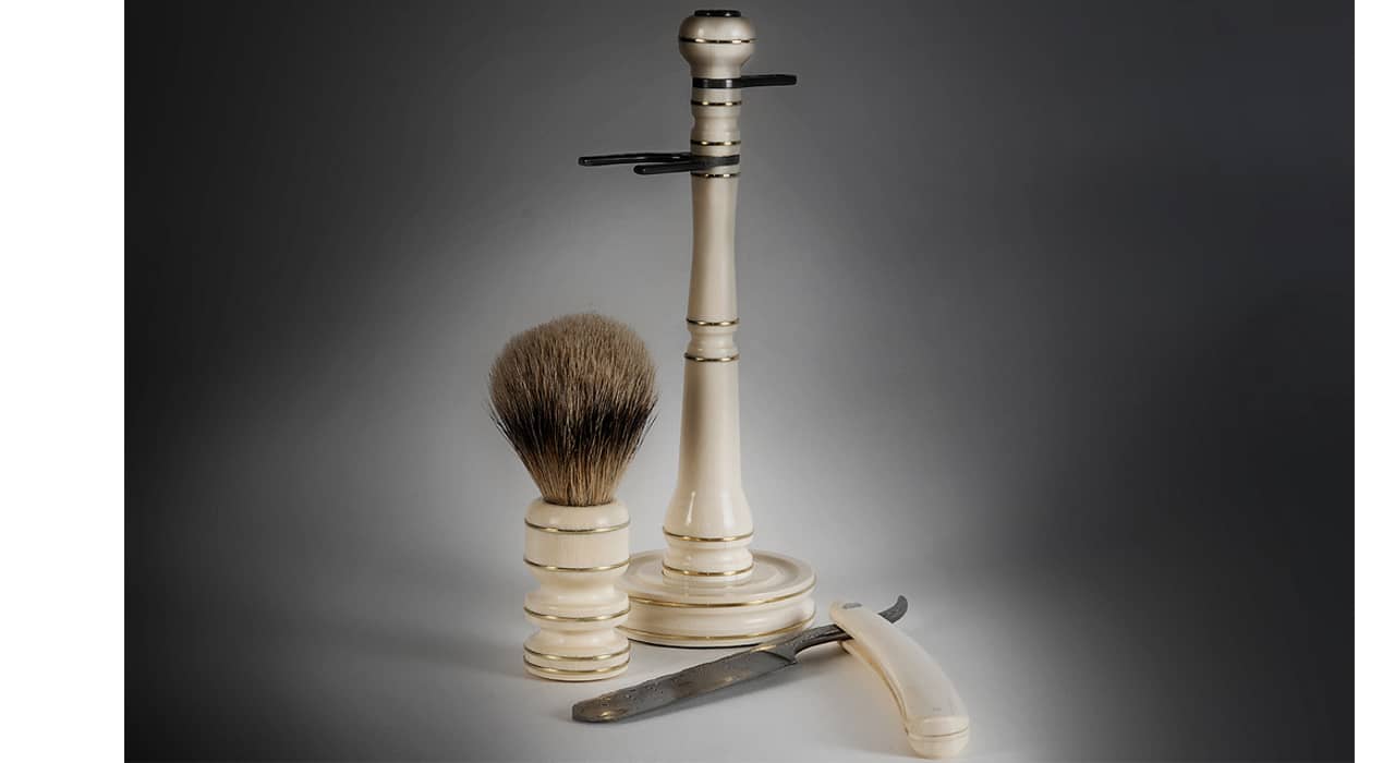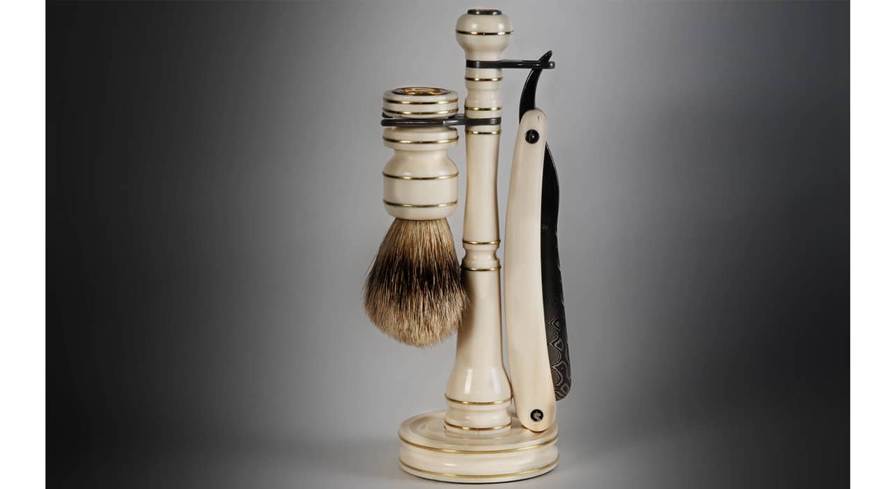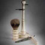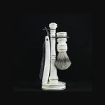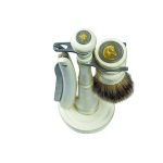 Бритвенный набор состоит из подставки, опасной бритвы и помазка.