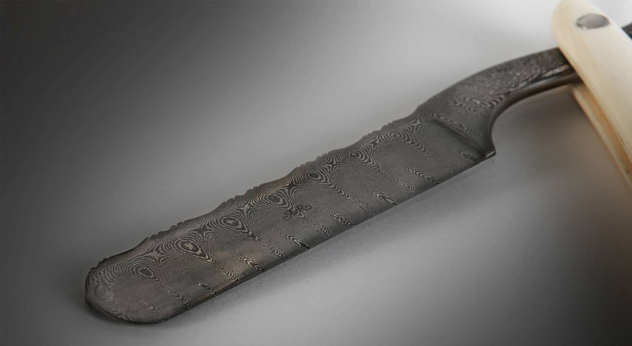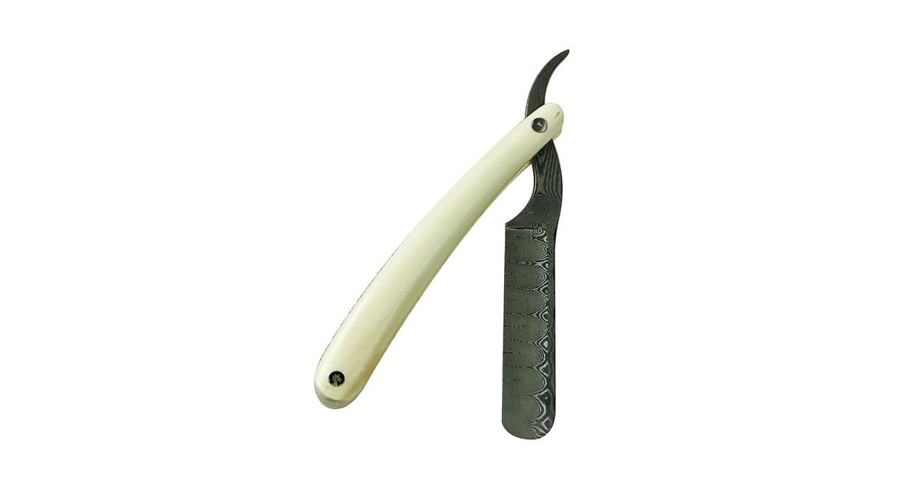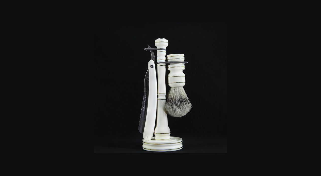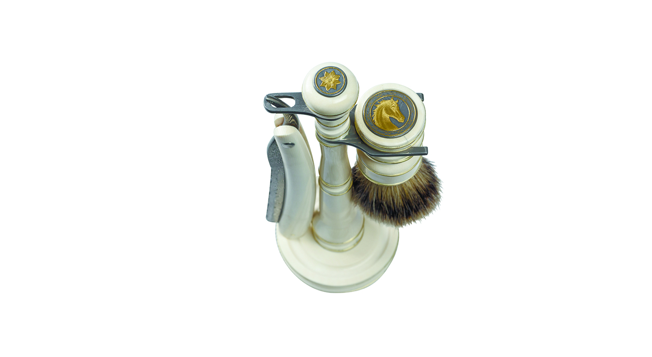 Бритвенный набор состоит из подставки, опасной бритвы и помазка. Все составные части изделия выполнены из слоновой кости молочного оттенка, отполированной до зеркального блеска. Изделия из слоновой кости появились еще во времена первобытно — общинного строя. Позже применение бивней получило широкое распространение в искусстве и стало считаться признаком роскоши и благосостояния. Лезвие и детали на кисточке, а также арматура выполнены из нержавеющей дамасской стали работы Фридриха Шнайдера ( Friedrich Schneider ) — одного из лучших мастеров по дамаску. Гравировка на ручке помазка принадлежит Эдварду Восу ( Edouard Vos ), знаменитому гравировщику ружей из Бельгии и изображает голову лошади с развивающейся гривой. Аад Ван Рейсвейк долгое время изучал историю классических лезвий, и это настолько его увлекло, что он решил создать бритвенный набор в классическом аристократическом стиле. В былые времена (вплоть до конца XIX века) для бритья, как известно, использовали опасные бритвы. В использовании опасной бритвы есть что-то действительно мужское, рискованное. Использование классической, дорого инкрустированной бритвы делает процесс бритья ритуалом, достойным королей. Вот что сам автор говорит о своем творении: «Создание этих бритвенных наборов навеяно ностальгией. В древние времена люди пользовались старинными бритвенными лезвиями. Я уже много лет делаю такие лезвия, поскольку мне это очень нравится. Но если Вы на мгновение приглядитесь к бритвам в специальных магазинах, Вы увидите классическую кисточку, но с современным лезвием. Древнее и современное плохо сочетаются вместе. Я же создал такой бритвенный набор, в котором все гармонично сочетается и возвращает в былые времена, когда люди еще пользовались классическими бритвами. Мое вдохновение проистекает именно из тех времён» .