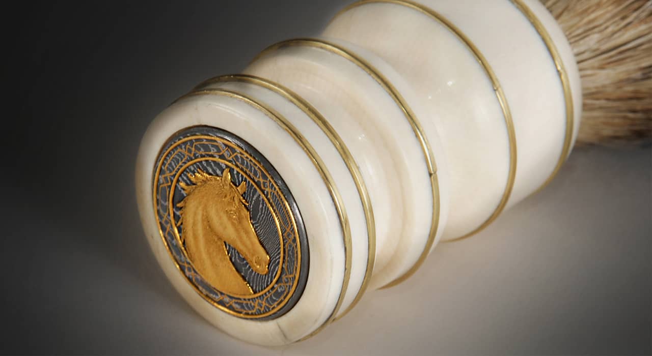 Гравировка на ручке помазка принадлежит Эдварду Восу ( Edouard Vos ), знаменитому гравировщику ружей из Бельгии и изображает голову лошади с развивающейся гривой.