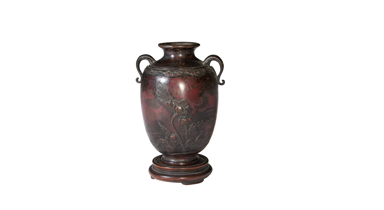 Хата Дзороку — мастер в третьем поколении династии, известной своими работами из бронзы. В период Эдо, в 1861–1864 годах, первый мастер династии сделал личные печати Императора Комэй и золотую печать Токугава Ёсинобу. В эпоху Мэйдзи мастера династии создали Печать Императора Японии и Печать Японского государства. Сейчас в Японии работает представитель шестого поколения династии. Ваза простой элегантной формы с широким горлом украшена двумя декоративными литыми ручками в форме листьев. Патинирование разным составом разделяет тулово на две области: нижняя часть вазы у основания покрыта более тёмной патиной; линия границы цветов напоминает волну или абрис горной вершины. Изделие обладает высокой художественной и культурной ценностью. Лаконичность формы и декора этой вазы делают её универсальной и как для японского интерьера, так и для дома в европейском стиле.