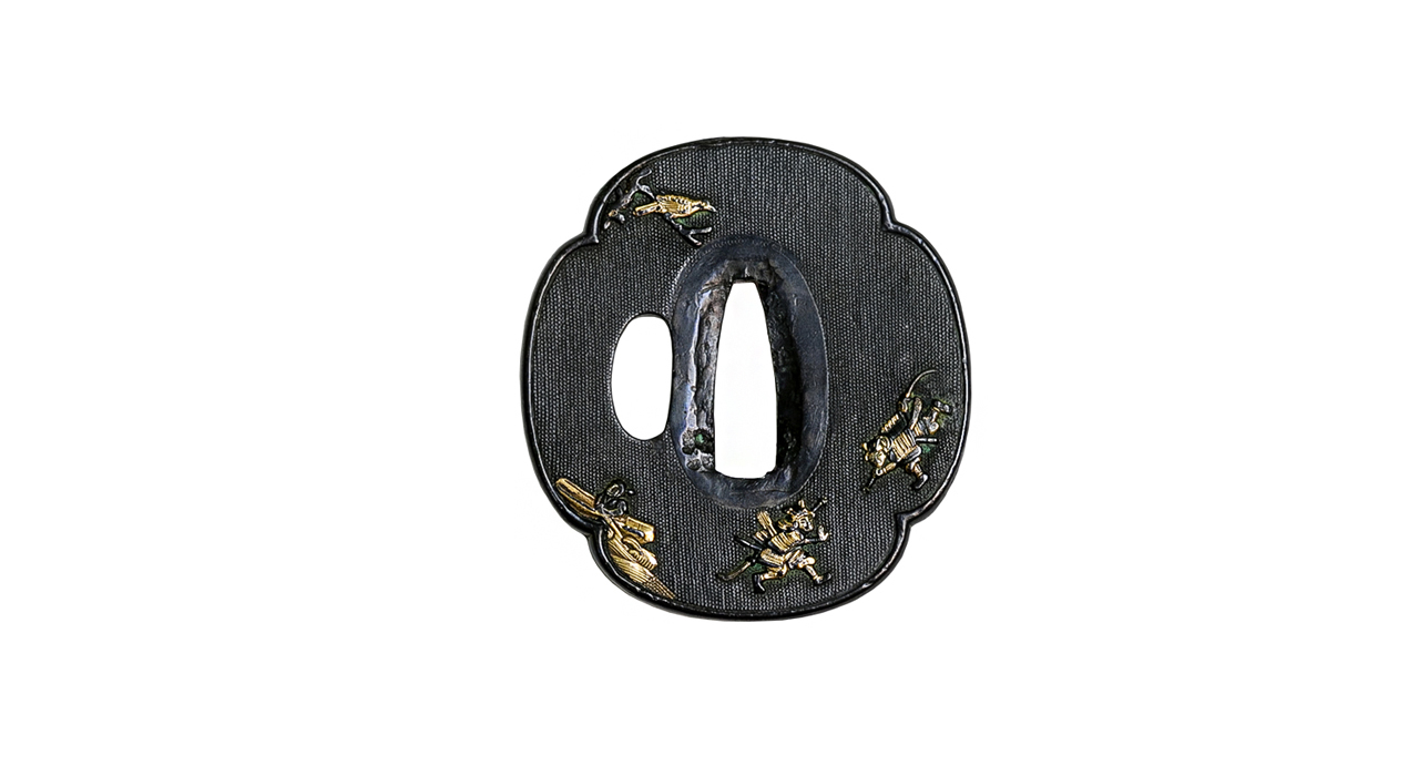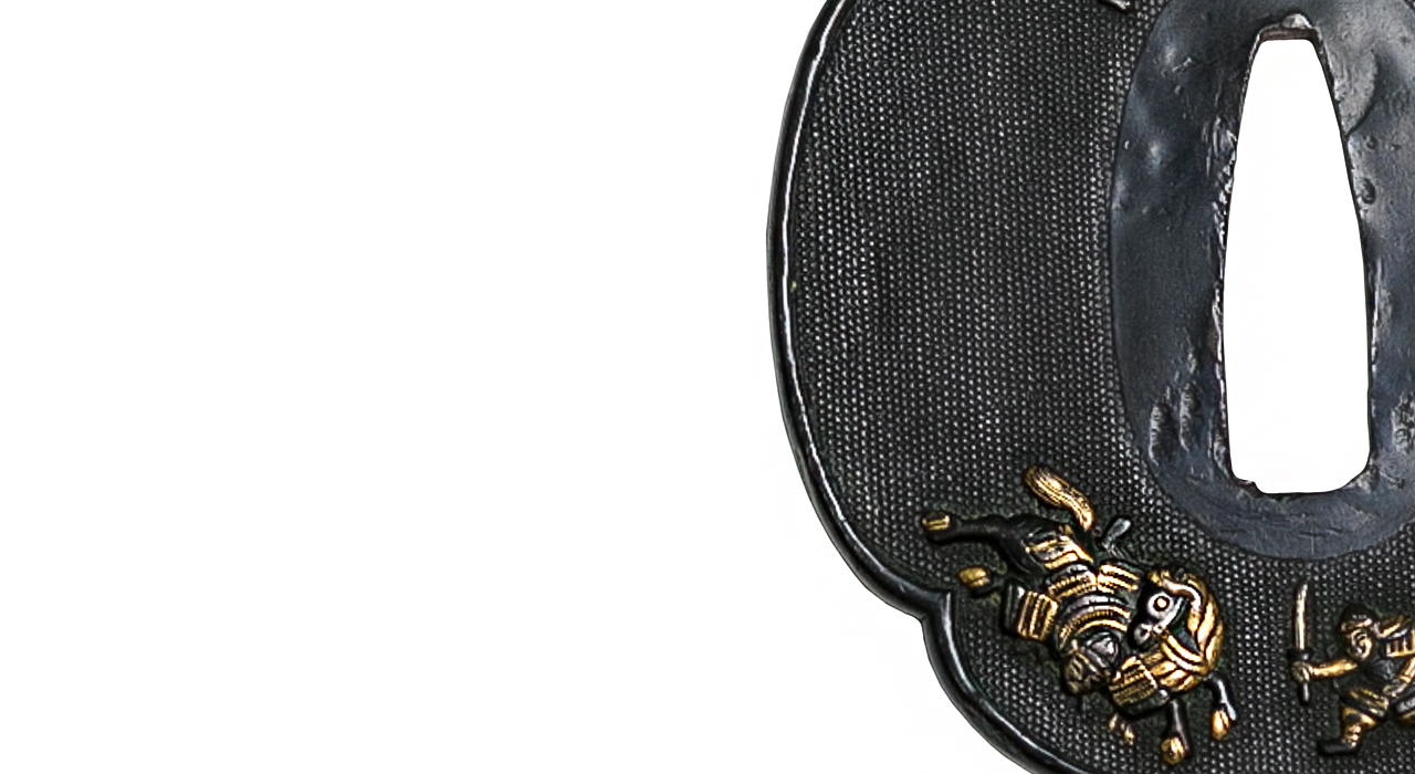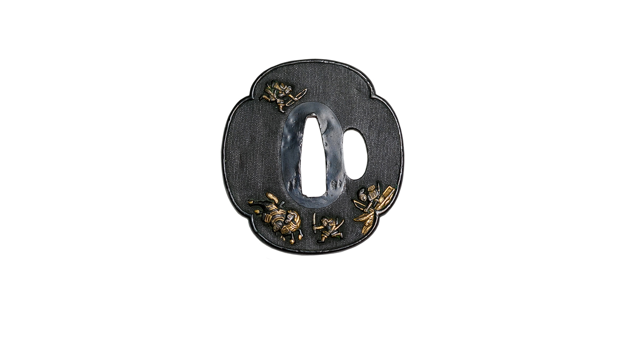 Неподписанная цуба формы мокко, выкованная из традиционного сплава сибуити (медь с серебром в пропорции 4:1) с ободом и одним отверстием кодзука-хицу . Поверхность декорирована темно-серой, почти черной патиной, имеет фактуру нанако – «икра». Украшена инкрустацией в технике такадзоган (высокий рельеф) с изображением сражающихся самураев – конных, пеших, сидящих в лодках; самураи изображены облаченными в доспехи о-ёрой и шлемы кабуто , вооруженными мечами, луками и алебардами нагината . Фигурки выполнены из сплавов сибуити или сякудо и покрыты позолотой.