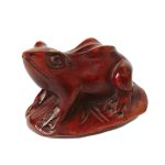 Фигура лягушки, сидящей на листе лотоса, выполнена из красноватого дерева (возможно – сакуры или груши), глаза обозначены чёрной краской. Резьба без мелкой детализации, крупными плоскостями, характерна для миниатюрных нэцкэ, приятна на ощупь.