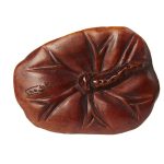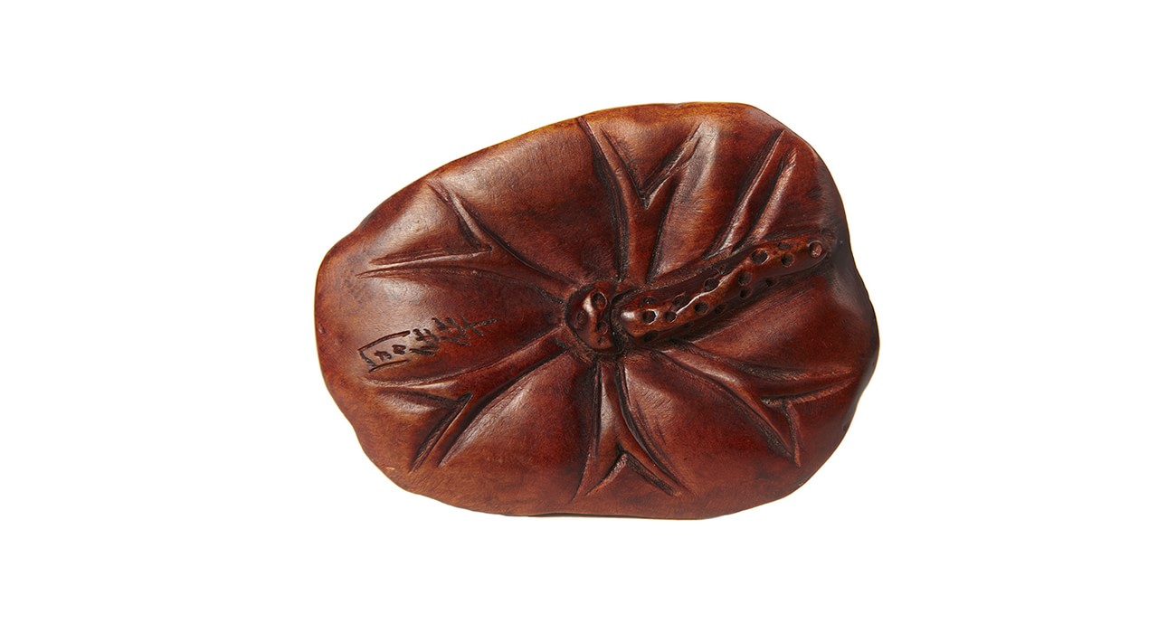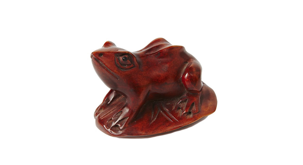 Мастер Ёсикава Фигура лягушки, сидящей на листе лотоса, выполнена из красноватого дерева (возможно – сакуры или груши), глаза обозначены чёрной краской. Резьба без мелкой детализации, крупными плоскостями, характерна для миниатюрных нэцкэ, приятна на ощупь. По характеру фигурка лягушки представляет собой переходный вид между нэцкэ (аксессуаром традиционного костюма, брелоком для ношения на поясе разнообразных необходимых предметов – коробочек для лекарства инро, кисетов, трубок, письменных принадлежностей) и окимоно – миниатюрной декоративной статуэткой. С нэцкэ фигурку сближает материал, сюжет и техника резьбы, обработка всей поверхности изделия, отсутствие плоскости для установки. На нижней части листа глубокими лаконичными линиями обозначены прожилки и часть стебля. Однако у фигурки отсутствует сквозное отверстие для шнура, которое является непременным элементом нэцкэ, а размер фигурки несколько больше, чем у традиционных нэцкэ. Лягушка является частым мотивом в нэцкэ и других видах декоративно-прикладного искусства. С одной стороны, лягушки в фольклорных верованиях Японии связаны с водоёмами, дождём и водой, несущими урожай и процветание. С другой стороны, японское слово «лягушка» — каэру – созвучно глаголу «возвращаться», что делает её изображение пожеланием благополучного возвращения домой, удачной и лёгкой дороги. Резчик происходил их мастерской нэцкэ, а фигурка выполнена после 80-х гг. XIX века, когда в Японии постепенно происходит смена повседневного чиновничьего и городского костюма на европейский, не предполагающий функционального использования нэцкэ. Фигурка имеет подпись мастера на нижней стороне листа.