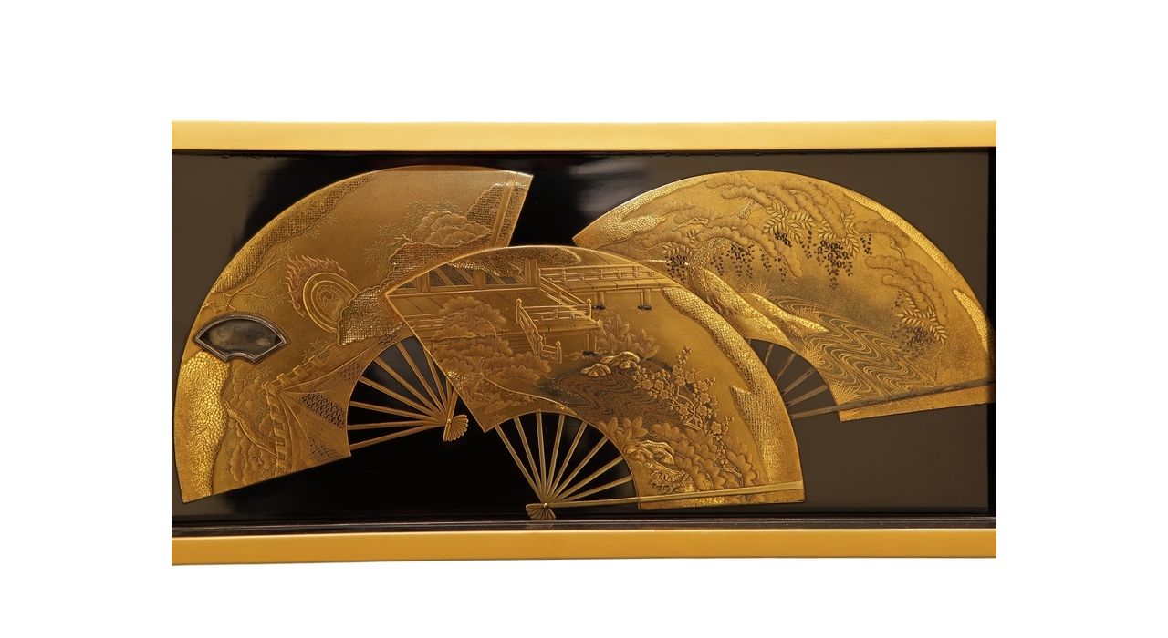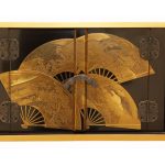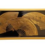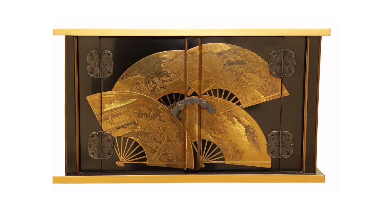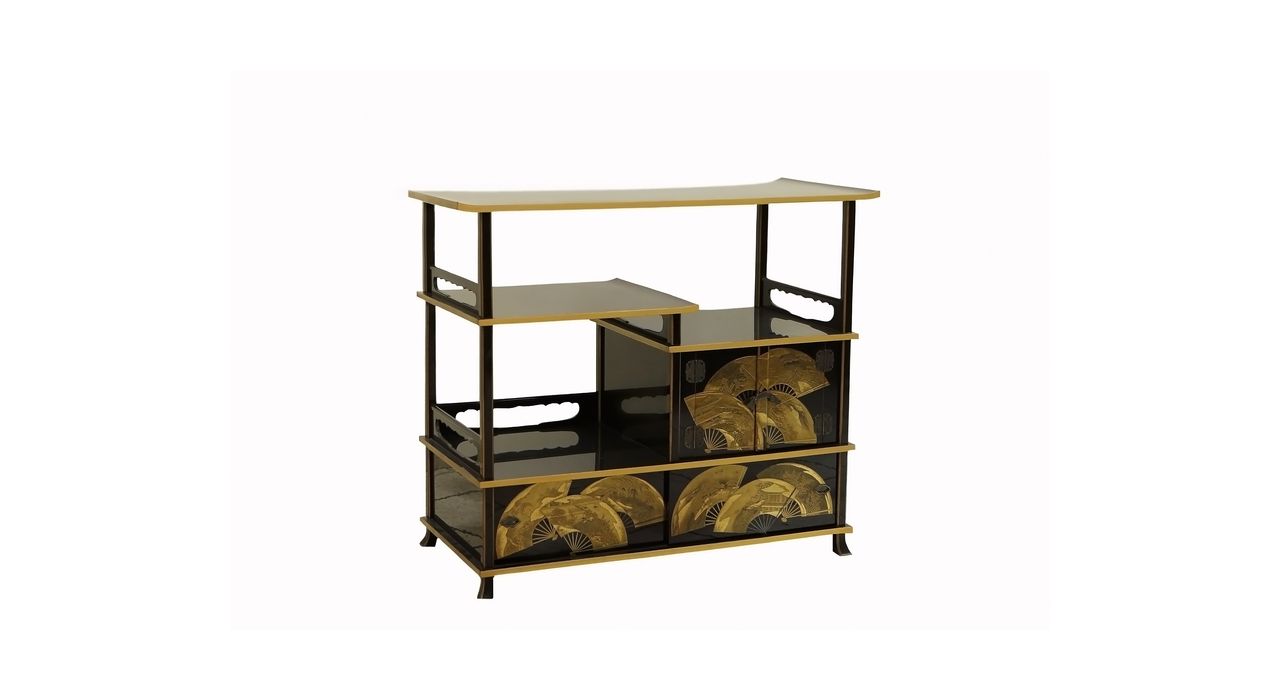 Комод-этажерка — традиционный вид японской мебели, предназначенный для хранения и демонстрации предметов коллекции ( окимоно , нэцкэ , керамики и фарфора), чайной утвари и других предметов обихода. Этажерка с полками на разной высоте позволяет разместить предметы разного размера. Комод выполнен из дерева и декорирован лаком в технике маки-э: на чёрном фоне в низком рельефе изображены раскрытые веера. Веер в Японии — это важный атрибут костюма и быта. В давние времена традиционной Японии веер говорил о высоком положении его владельца в обществе. На представленном комоде на веерах изображены прекрасные японские пейзажи.