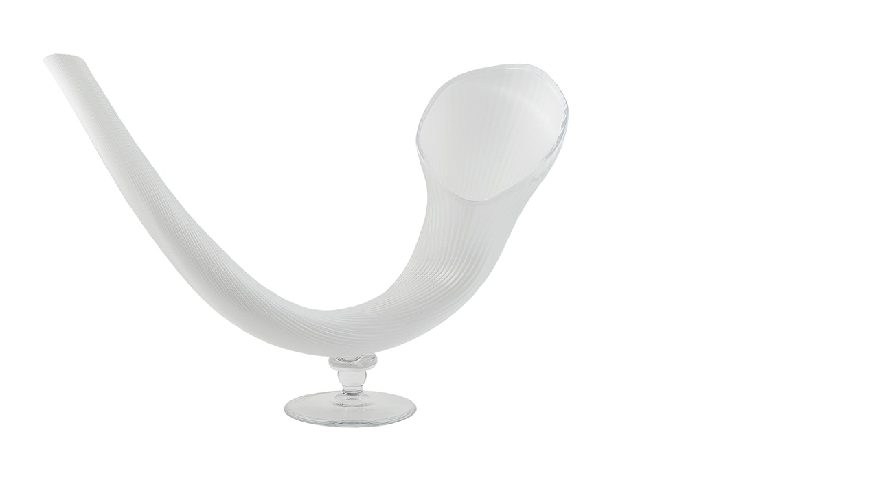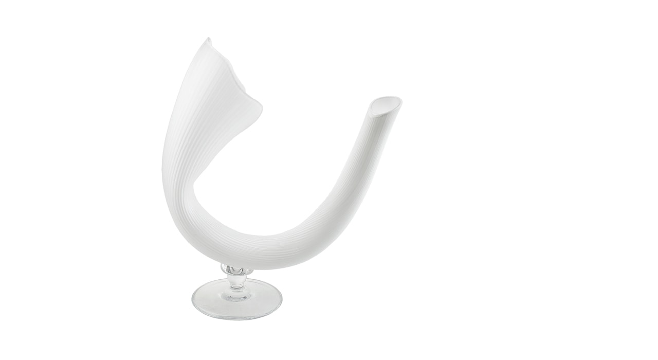 Оригинальная ваза из стекла белого цвета выполненалегендарным чешским дизайнером Боржеком Сипеком. Композиция представляет собой закрученный спиралью рог. Края горловины вазы выполнены неравномерно. Каждый волен трактовать задуманный автором образ по-своему. Словно волшебный цветок, открывший свой бутон солнцу, ваза излучает волшебное свечение. Прозрачное стекло создает преломление цвета и в зависимости от освещения, изделие играет разноцветными бликами. Ваза представляет собой магический арт-объект, который станет украшением современного интерьера.