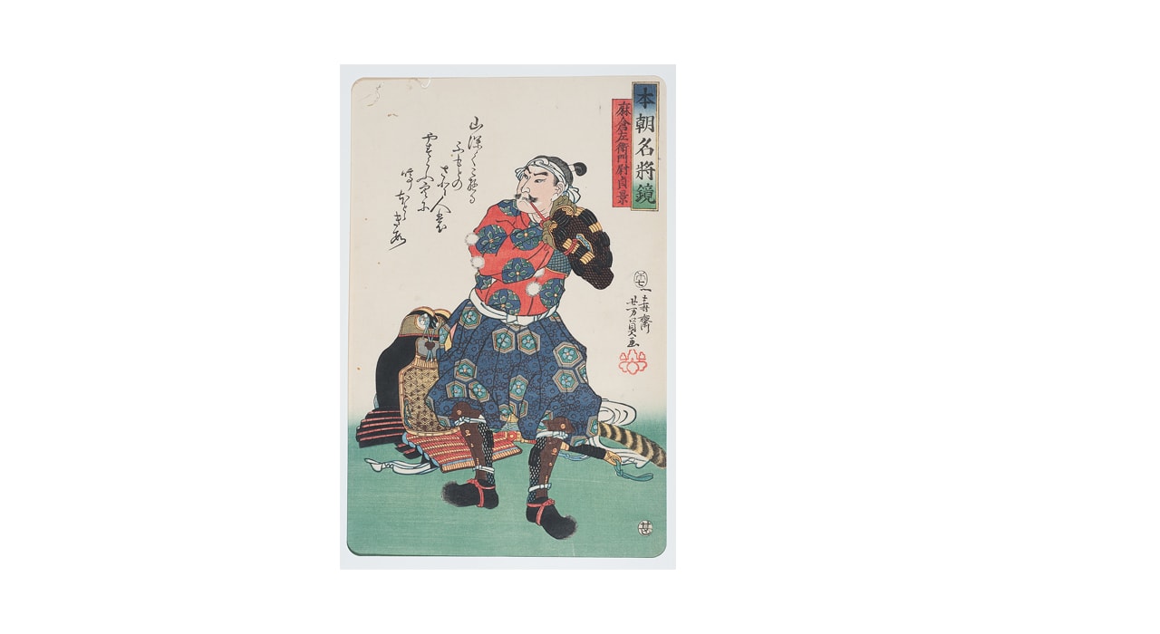Серия цветных гравюр «Зерцало прославленных военачальников» («Хонтё̄ Мэйсё̄ Кагами») была создана художником Утагава/Итиюсай Ёсикадзу. Настоящее имя и годы жизни Утагава Ёсикадзу не известны. Мастер жил в Эдо во второй половине XIX века, активно работал с 1848 по 1870 г. Ёсикадзу был учеником мастера Утагава Куниёси и последователем школы Утагава. Как и его учитель Ёсикадзу занимался гравюрами с изображениям легендарных героев и исторических персонажей, муся-э («изображение воинов»). Популярность жанра муся-э в то время была обусловлена тем, что во второй половине XIX в укладе жизни японцев происходили серьезные перемены: окончание периода изоляции, падение сёгуната, восстановление императорской власти. В ответ на такие перемены японские мастера-граверы вновь обратились к своей истории, традициям и великим героям прошлого. За период своего творчества художник создал много исторических серий, среди которых «Тайхэйки» («Повесть о Великом Мире») и «Хэйкэ моногатари» («Повесть о доме Тайра»). Серия «Зерцало прославленных военачальников» была создана в 1858 году. Все листы серии напечатаны в формате обан (24х34,5), имеют подпись художника и печать издательства Маруя Дзимпати (Эндзюдо̄). Цикл гравюр был посвящен таким деятелям как самурайский полководец, даймё Асакура Садакагэ 麻倉貞景 (1358-1436), генерал Асикага Тадаёси 足利直義 (1306-1352) и самурай Такэда Нобусигэ 武田信繁 (1525-1561). Оригинальность художественного стиля гравюр Ёсикадзу заключается в том, что с одной стороны изображение героев сдержанно и строго, а с другой – несет внутреннее напряжение и своеобразное изящество. Асакура Садакагэ (1473-1512) был даймё провинции Этидзэн. Слово «саэмондзё» 左衛門城 обозначает название официального поста в Японии – старший офицер левой дворцовой гвардии. Он присваивался самураям (буси) во времена эпох Камакура (1185-1333) – Эдо (1603-1868). Асакура Садакагэ был потомком влиятельного самурайского клана Асакура. Садакагэ изображен надевающим доспехи. Одной рукой и ртом он затягивает шнур на котэ (наручи). Сзади него, на полу, лежит кираса до (элемент доспеха, защищающий спину и грудь воина), меч и другие элементы японского доспеха, которые Садакагэ оденет перед боем. Поза даймё решительна: ноги широко расставлены, он смотрит вдаль, обдумывая предстоящий бой.