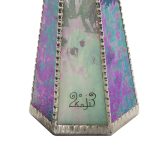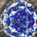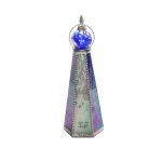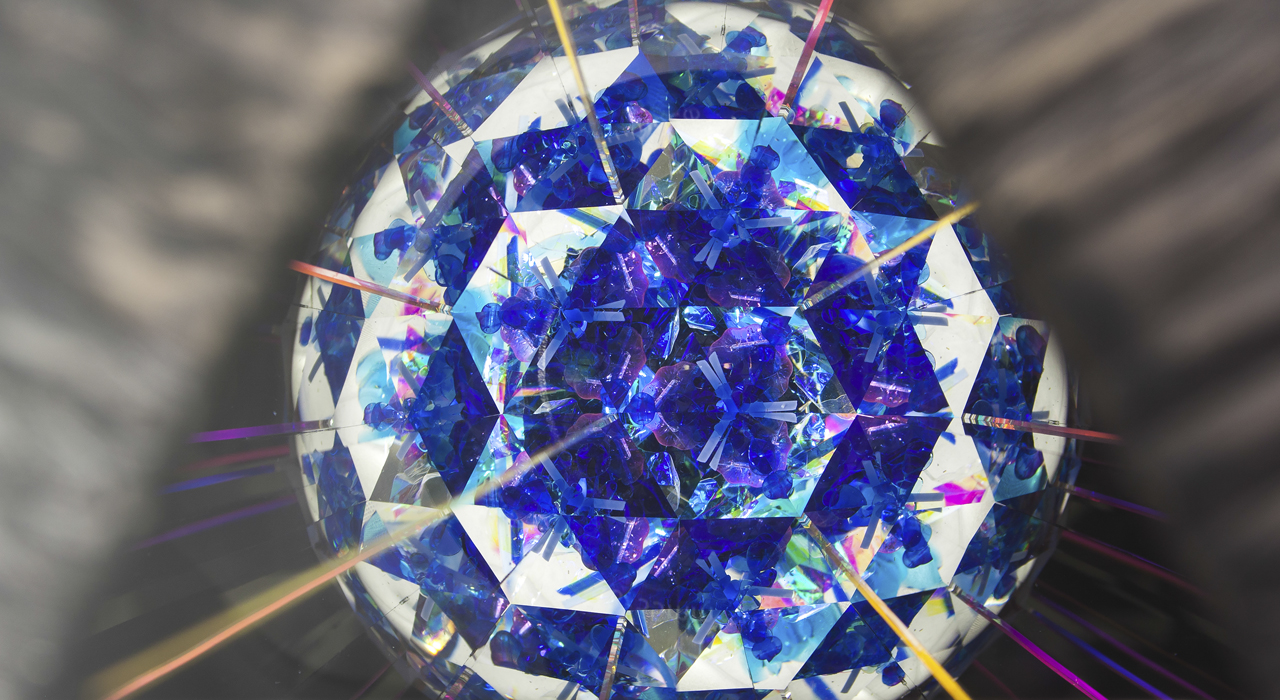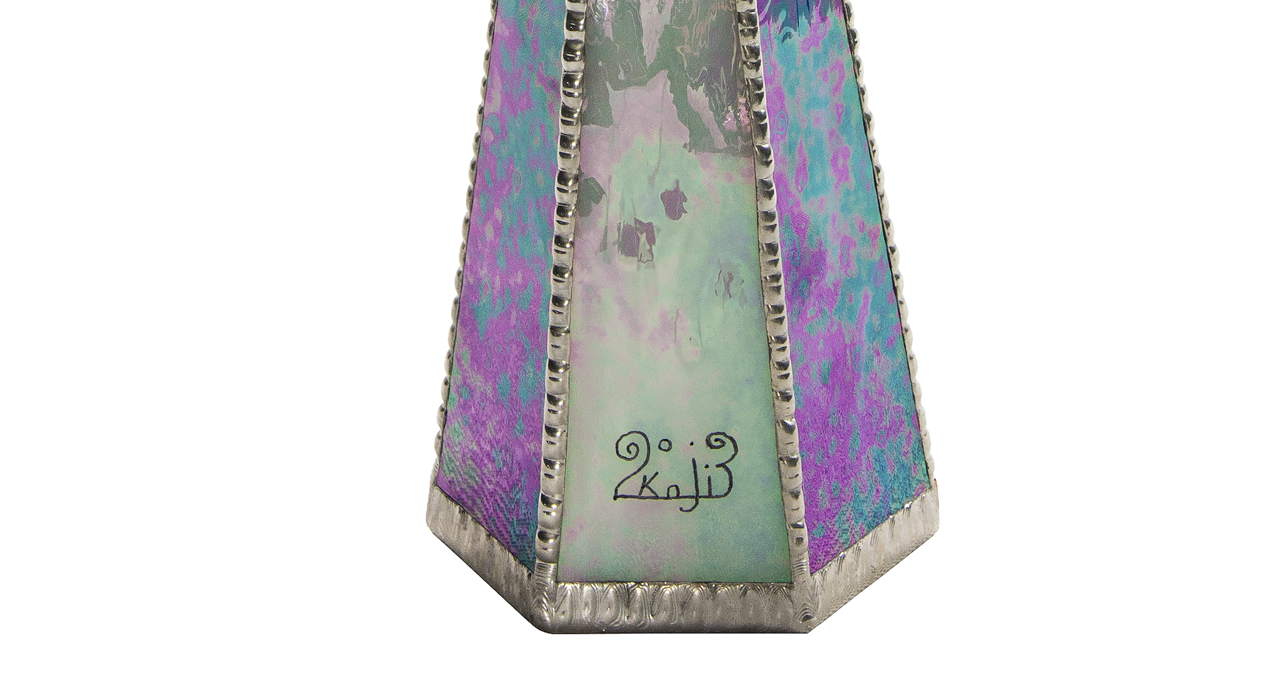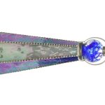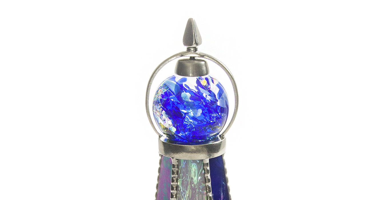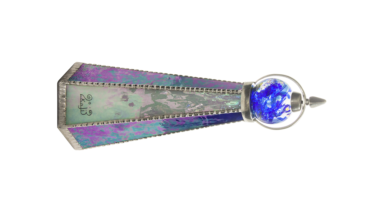 Оригинальный корпус калейдоскопа в форме шестигранной пирамиды выполнен из перламутрового стекла сине-фиолетовой цветовой палитры. В переводе с греческого слово «калейдоскоп» означает «смотрю на красивый вид». Данный калейдоскоп необычен и по своей форме, и по способу представления «волшебной мозаики». Изделие венчает стеклянная сфера, заполненная маслянистой жидкостью, в которую помещены различной формы бусины холодных синих оттенков. Узоры в таком калейдоскопе меняются плавно, завораживая таинственной игрой света и цвета. В этой «волшебной трубе» сочетаются как красота рождаемых внутри образов, так и внешнее изящество самого изделия, что выводит его на уровень настоящего произведения искусства. Внешне калейдоскопа напоминает магический атрибут, ключ к неизведанным мирам, что позволяет ему стать прекрасным украшением интерьера. Калейдоскоп создан в мастером Кодзи Ямами , который является призёром различных выставок, а так же лауреатом Конвенции Брюстерского Сообщества Калейдоскопов . На изделии стоит подпись мастера.