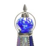 Данный калейдоскоп необычен и по своей форме, и по способу представления «волшебной мозаики». Изделие венчает стеклянная сфера, заполненная маслянистой жидкостью, в которую помещены различной формы бусины холодных синих оттенков. Узоры в таком калейдоскопе меняются плавно, завораживая таинственной игрой света и цвета.