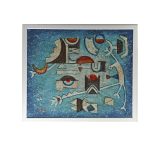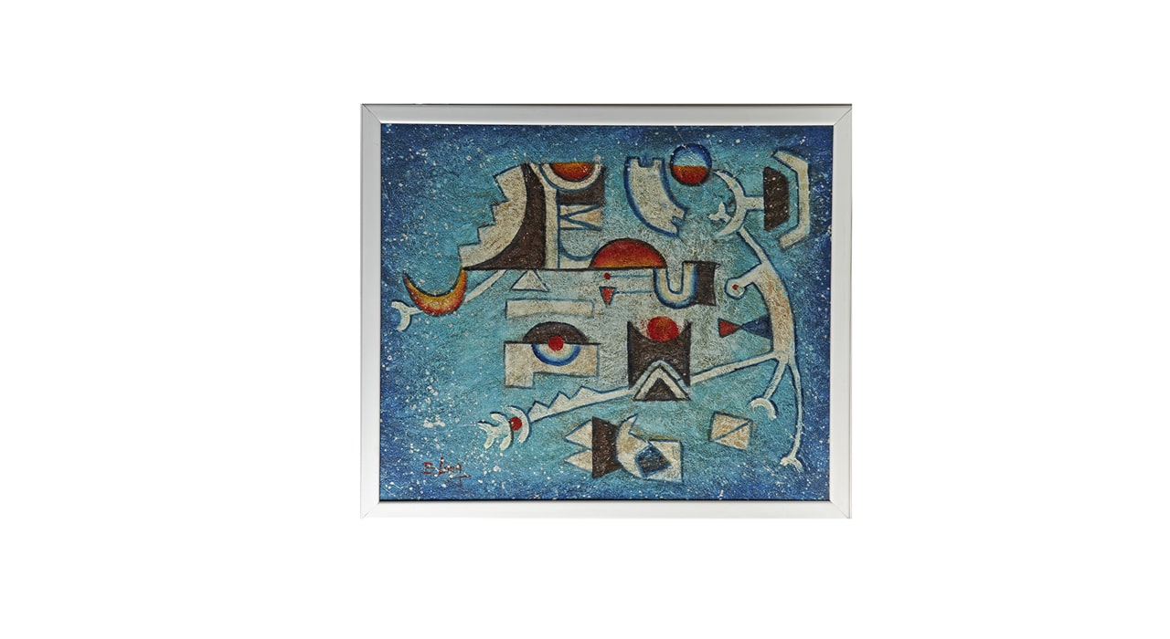 На полотне квадратного горизонтального формата изображены геометрические фигуры, произвольно разбросанные по холсту. Фон выполнен лазурной заливкой, уплотняющейся по мере отдаления от центра полотна. Центр полотна не тронут заливкой, что придает изображение объем. Слева внизу на полотне имеется автограф мастера латиницей B.Long. Рисунок напоминает шаманские амулеты. Особенностью данной картины является оригинальное выполнение на кокосовом волокнистом полотне, что придает изображению интересную текстуру.