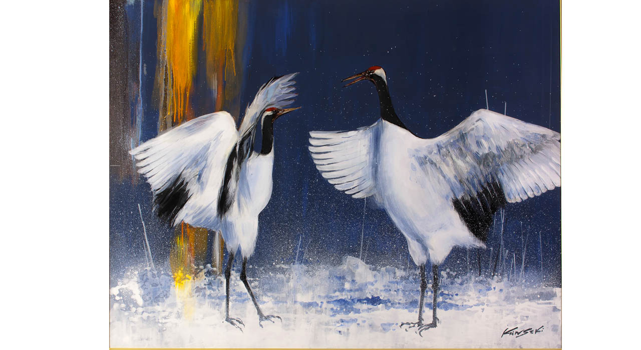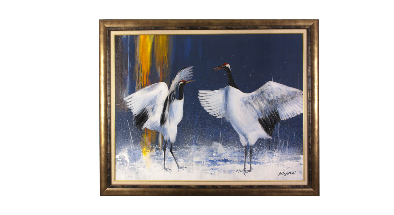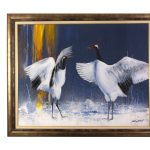 На полотне почти квадратного формата изображены танцующие журавли. Справа на полотне изображения помещена подпись мастера латиницей.