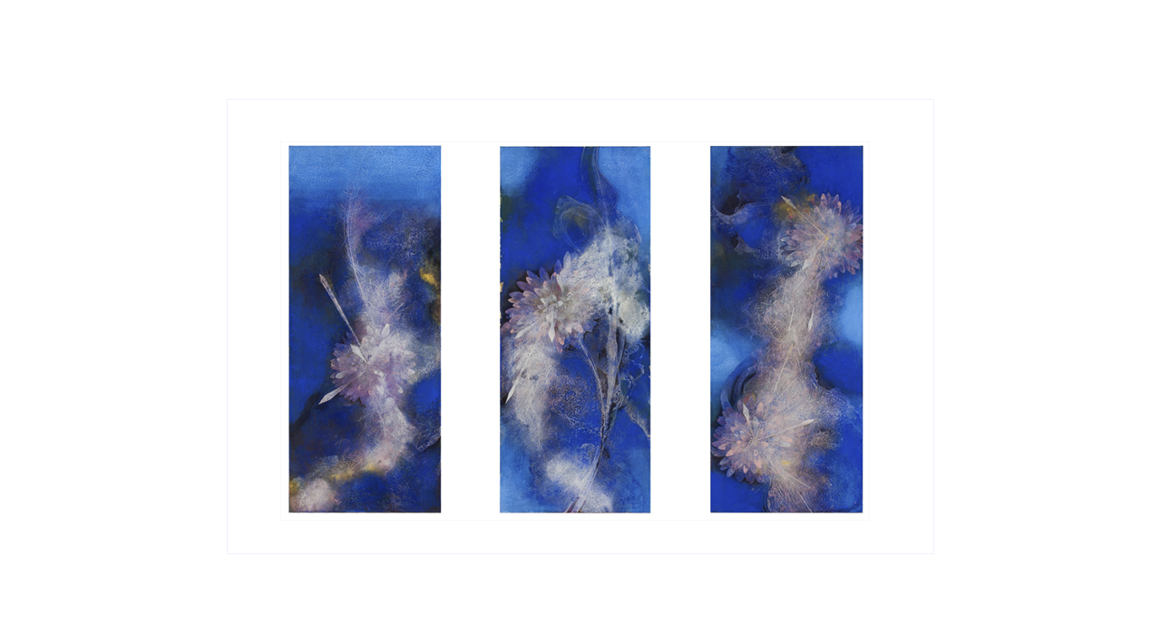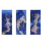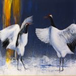 Крупные фигуры журавлей на полотне изображены в динамике. Тела птиц с белоснежным оперением выгодно контрастируют с плотным глубоким синим фоном.