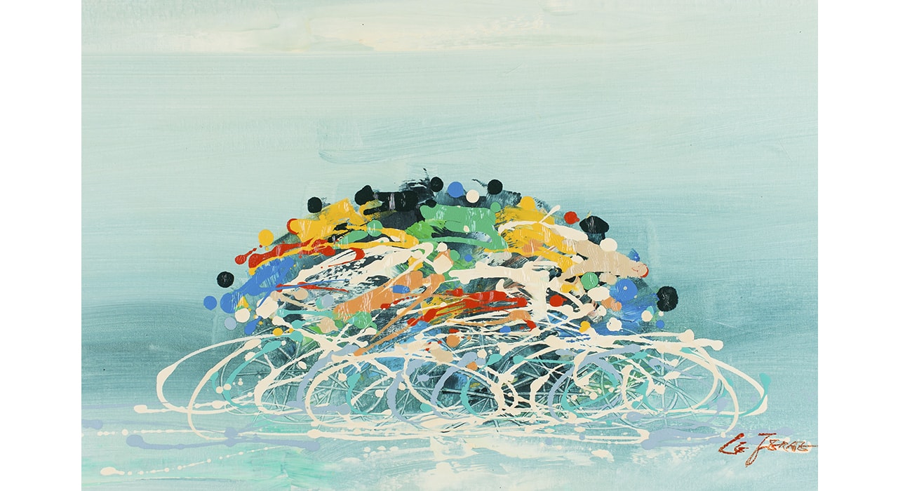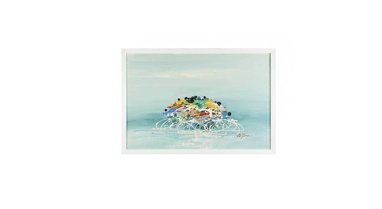 На полотне практически квадратного формата изображена абстрактная композиция плотными мазками: краски, словно вырвавшись на свободу из тюбика, переплелись в радостном суматошном танце. Художник использует очень яркую насыщенную палитру цветов — красный, желтый, зеленый, голубой, темно-синий. Сплошной фон полотна выполнен в нежно-голубой цветовой гамме с редкими переходами из голубого в белый. Справа внизу полотна имеется автограф художника латиницей Le Jeraz. Картина станет прекрасным дополнением к современному интерьеру и привнесет в образ помещения жизнерадостность.