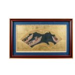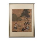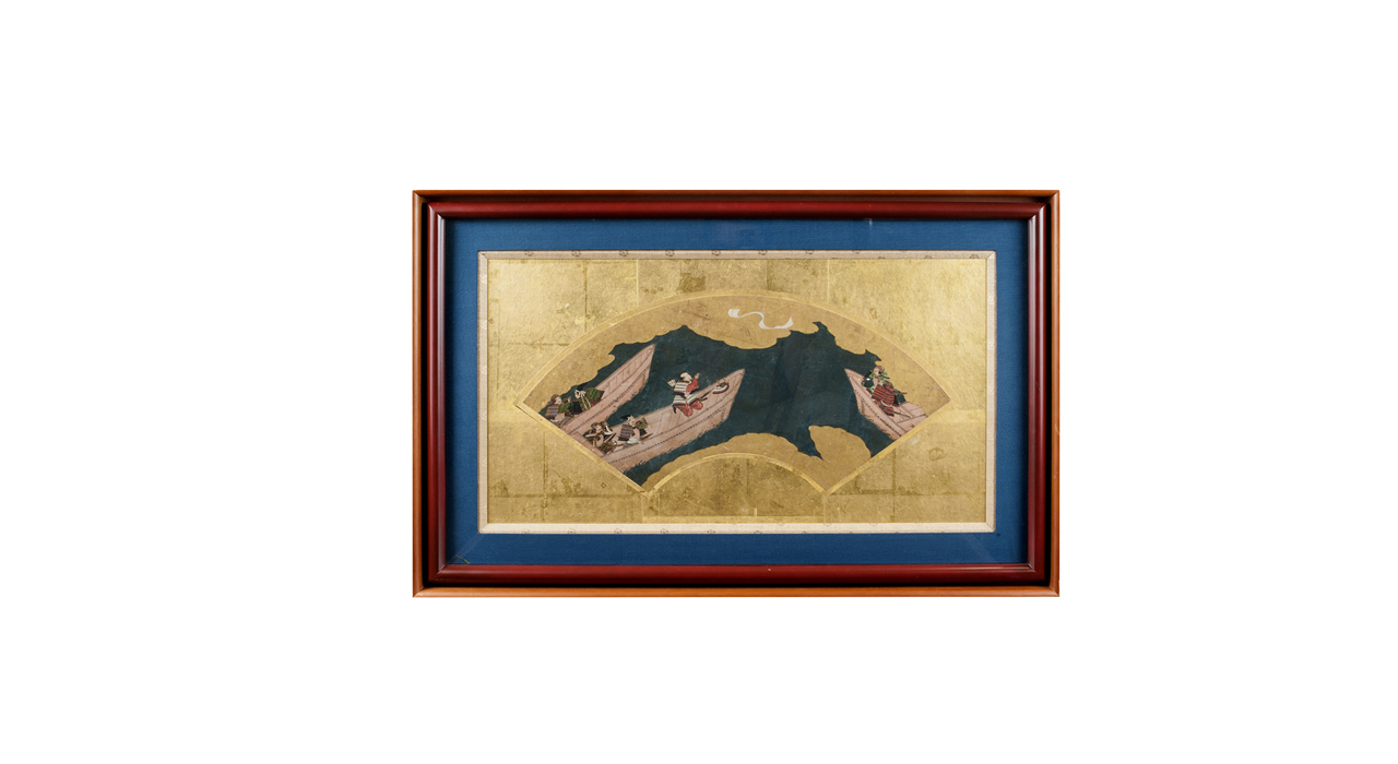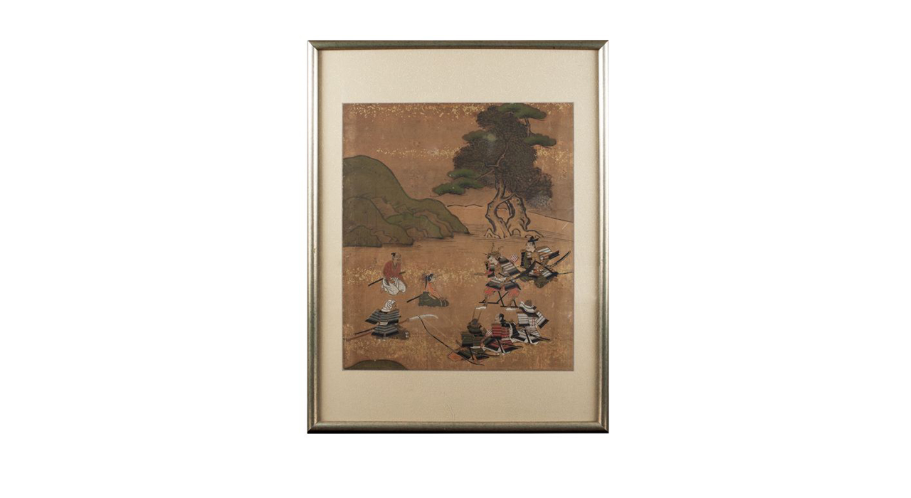 Лист с живописью представляет собой фрагмент ширмы или горизонтального свитка с изображением воинских сцен (о фрагментарности говорит незавершённость композиции, обрезанный нижней кромкой элемент пейзажа и верхней – часть кроны дерева). Изображение нанесено плотными темперными красками, фон частично декорирован в технике «кириканэ» — квадратиками золотой фольги, наклеенными на бумагу. Участки кириканэ создают так называемые «золотые облака» — способ декорации, характерный для декоративной живописи (свитков, ширм, стенных панелей), росписи керамики и оформления лаков. Сцена изображает группу воинов: справа – полководца, сидящего на раскладном стуле в окружении высокопоставленных вассалов; слева – группу воинов более низкого ранга, среди которых изображена женщина-воин. Форма шлема военачальника, его изображение сидящим на раскладном стуле, указывают на Такэда Сингэн (1521-1573), одного из самых прославленных воинов эпохи Сражающихся провинций. Такэда Сингэн был известен привлечением на службу воинов-синоби (ниндзя) и женщин-лазутчиц, куноити. Часть этих девушек были воспитанницами дамы Мотидзуки Тиёмэ, создавшей первую в Японии группу женщин-ниндзя, первоначально обучавшихся и скрывавшихся под видом синтоистсих храмовых служительниц мико. Возможно, женщина-воин, беседующая с военачальником, является куноити, отчитывающейся о разведке или операции перед Такэда Сингэн. Свитки и ширмы с сюжетами, основанными на военных повестях «гунки», были распространены в XVIII веке и создавались в прославленных живописных школах, таких как Кано. Оформленный паспарту и рамкой фрагмент декоративной живописи представляет коллекционную ценность и может быть элементом декора интерьера.