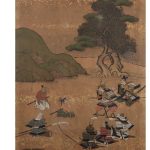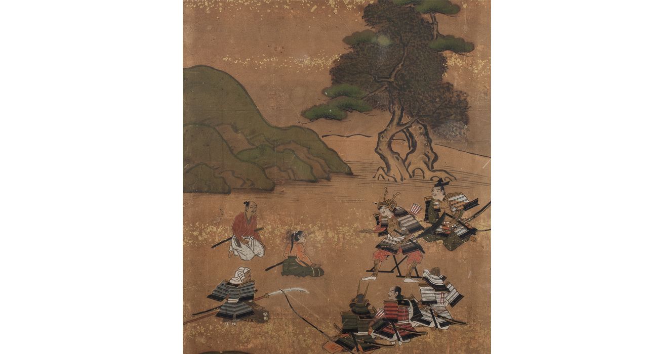 Сцена изображает группу воинов: справа – полководца, сидящего на раскладном стуле в окружении высокопоставленных вассалов; слева – группу воинов более низкого ранга, среди которых изображена женщина-воин. Форма шлема военачальника, его изображение сидящим на раскладном стуле, указывают на Такэда