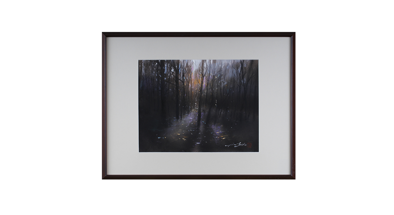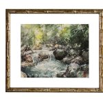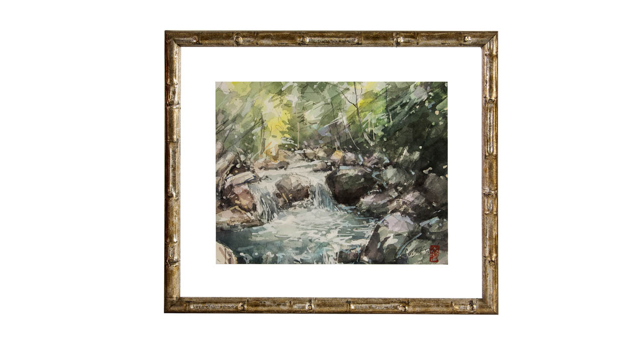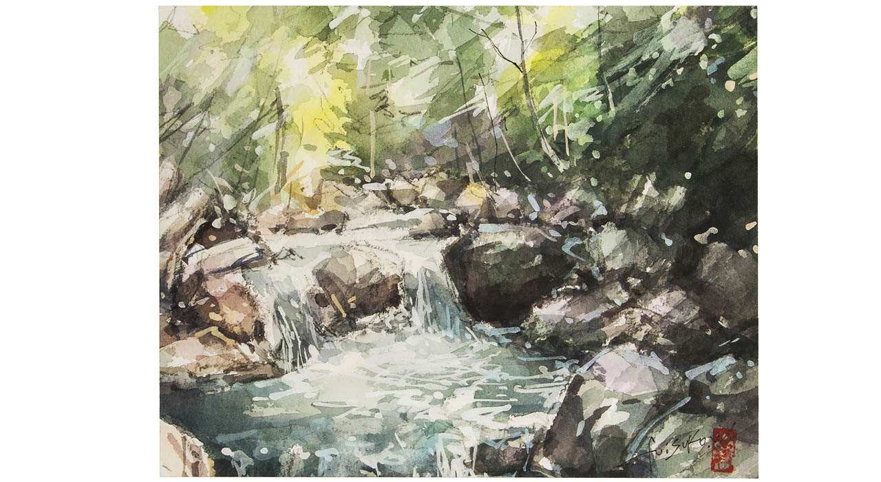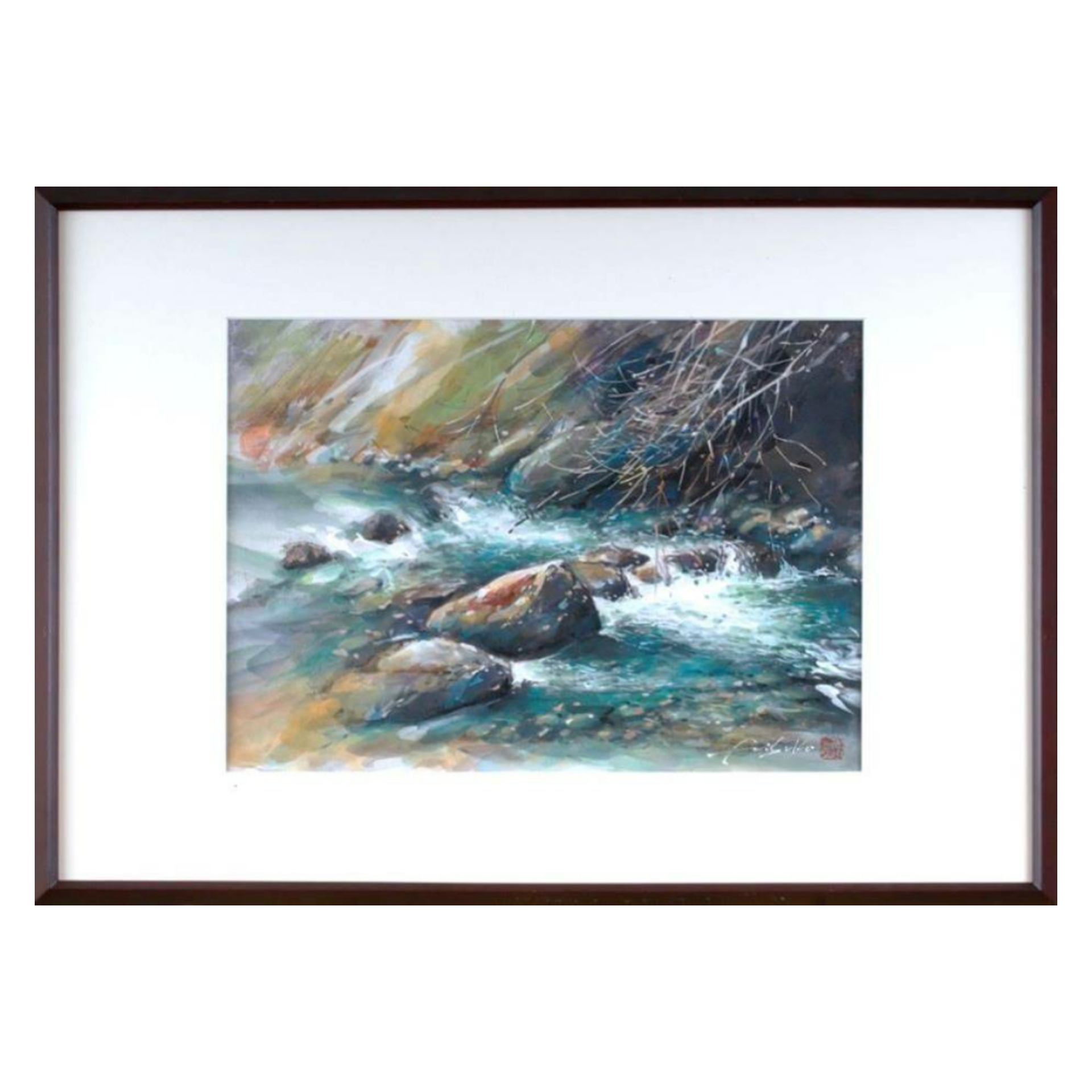 На полотне «Японский горный поток» изображено движение горного ручья по каменистым порогам. Над потоком склоняются ветви деревьев, залитые солнечным цветом.