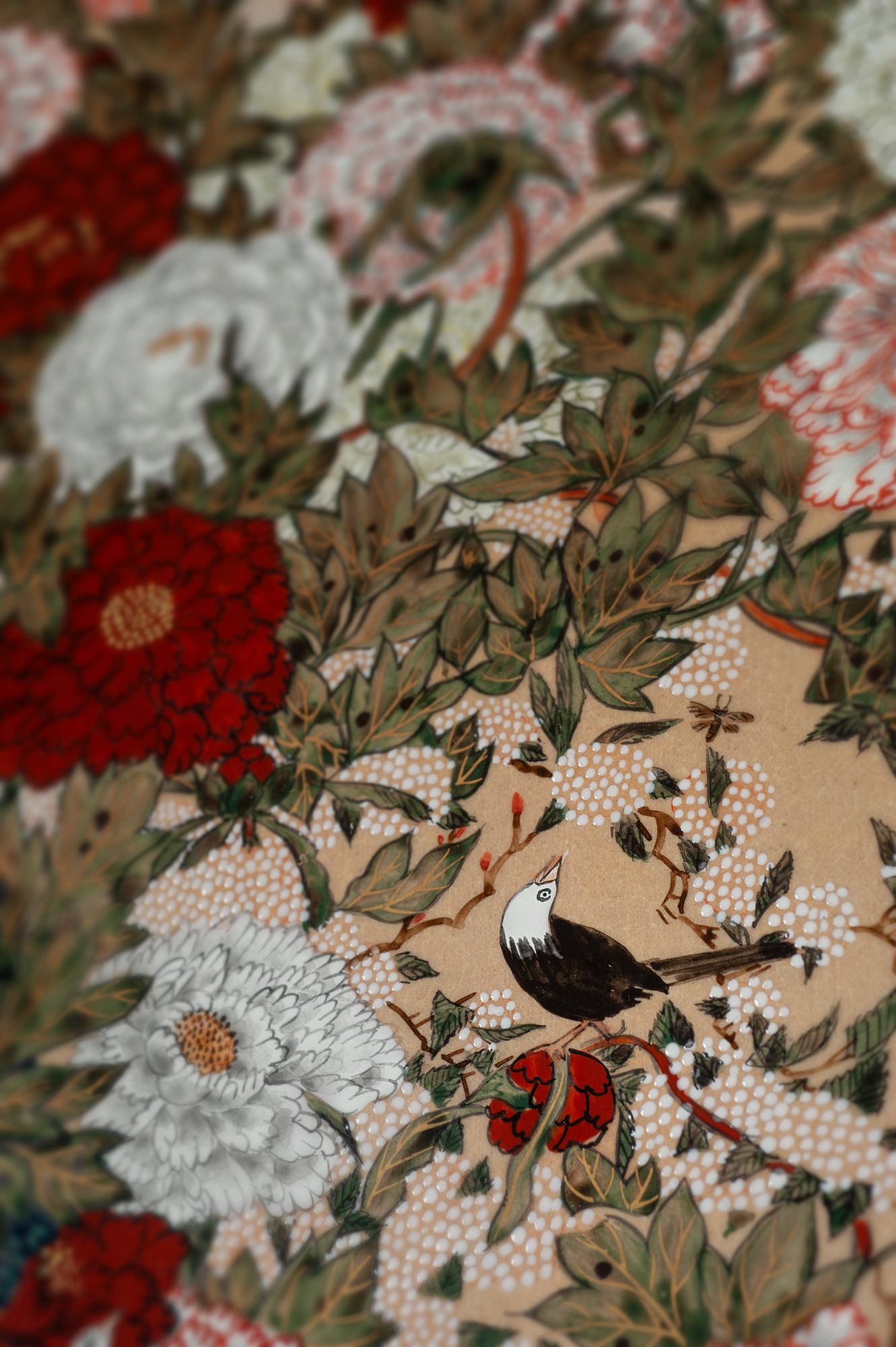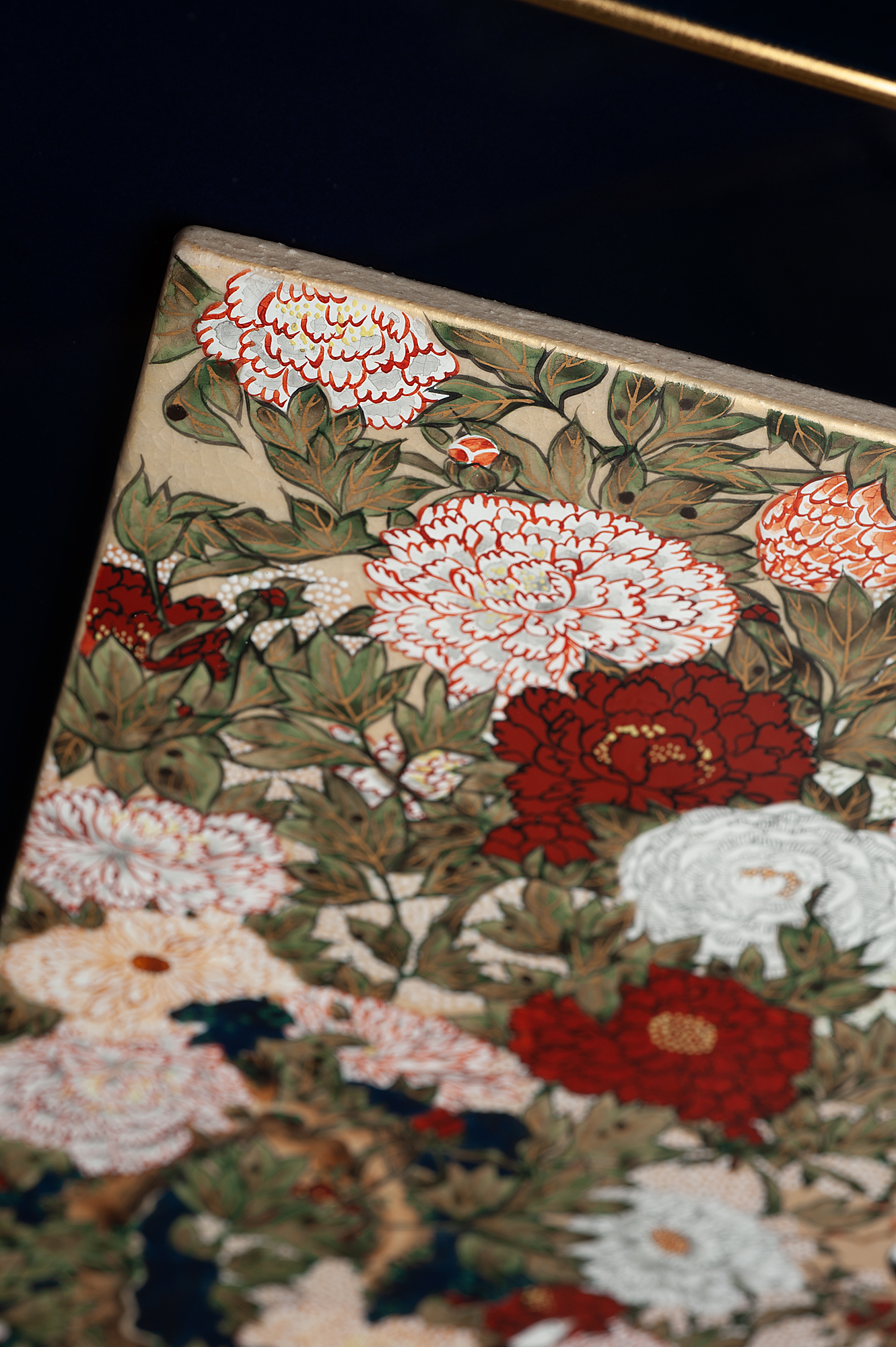 В своей работе мастер взял за основу картину известного японского художника эпохи Эдо (1603-1868) – Ито Дзякутю (1716-1800). Интересно, как мастер воссоздал все детали произведения Дзякутю, но в ином материале. Ямаока Дзэнсё известен подобными работами, созданными по мотивам известных произведений японских мастеров разных эпох. Для мастера это своего рода дань традициям, как в технологическом плане – его работы в большинстве своём выполнены в стиле сацумской керамики, так и в тематическом – воссоздавая известные образы и мотивы в своих керамических изделиях. Помимо работ Ито Дзякутю, Ямаока Дзэнсё брал за основу произведения – художника Хасэгава Тохаку (1539-1610), художника и керамиста Огата Кэндзан (1663-1743) и других известных представителей разных направлений. Картина Ито Дзякутю была создана между 1757 и 1766 годами и в дальнейшем была передана в дар храму Сёкокудзи вместе с «Сандзоном Шакьямуни» для вечной панихиды по его родителям, младшему брату и самому Дзякутю. Позже она была подарена императору Мэйдзи храмом Сёкокудзи, а сейчас находится в коллекции музея Сан-но мару – Музея императорских коллекций. Работа «Маленькие птички с пионами» считается аналогом «Маленьких птичек с розами“, также созданной Ито Дзякутю. Ямаока Дзэнсё работает в области керамики, начиная с 16 лет, в возрасте 27 лет он основал свою мастерскую в городе Ивакура, префектура Аити. Мастер объясняет свой выбор местности для основания печи близостью к природе и историческим памятникам, в которых он находит вдохновение. Ежегодно в его мастерскую поступают новые ученики, Ямаока Дзэнсё ставит своей целью обучить их традиционным технологиям изготовления керамических изделий. Основой его работы является чайная утварь, выполненная в стиле Кё-яки и Киёмидзу-яки, но также пробует себя в новых жанрах и направлениях. В данной работе мастером применяется надглазурная и подглазурная роспись, благодаря которому создаются красивые переливчатые эффекты красок.
