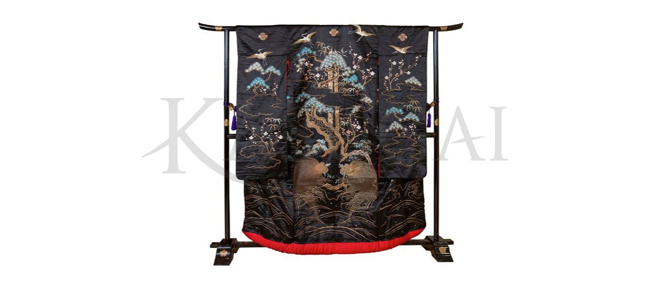 Кимоно представлено в комплекте со специальной вешалкой, изготовленной из дерева и покрытой лаком уруси. Размещенное на вешалке кимоно демонстрирует все богатство своего декора и может служить особым необычным украшением интерьера, привнося в него изысканный восточный колорит.