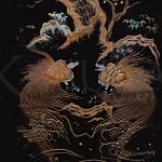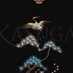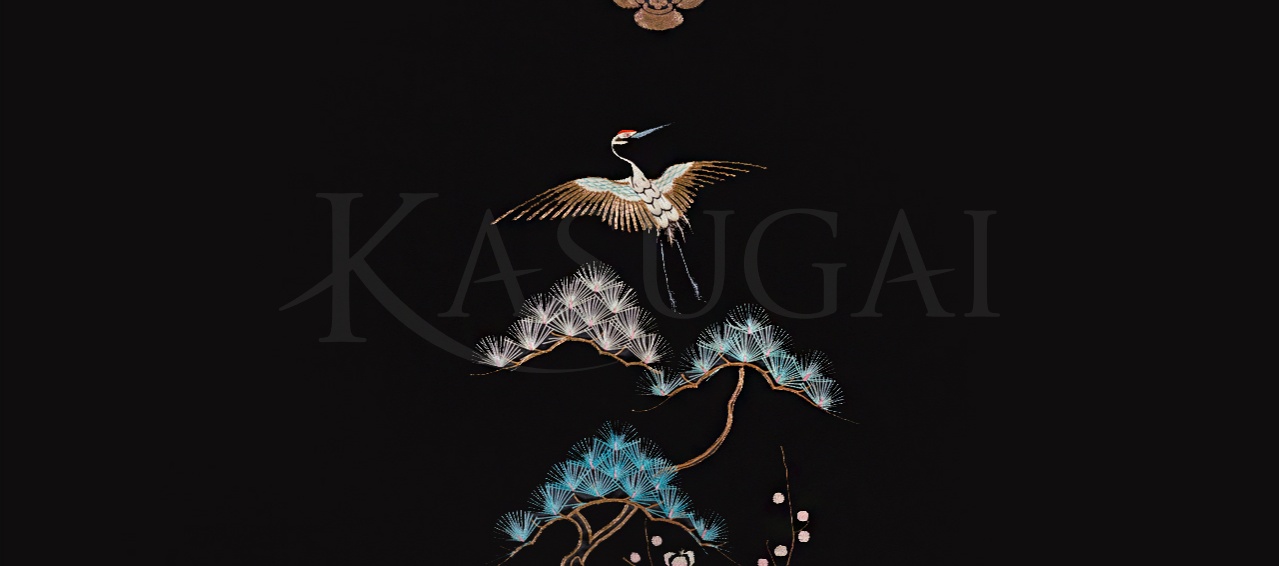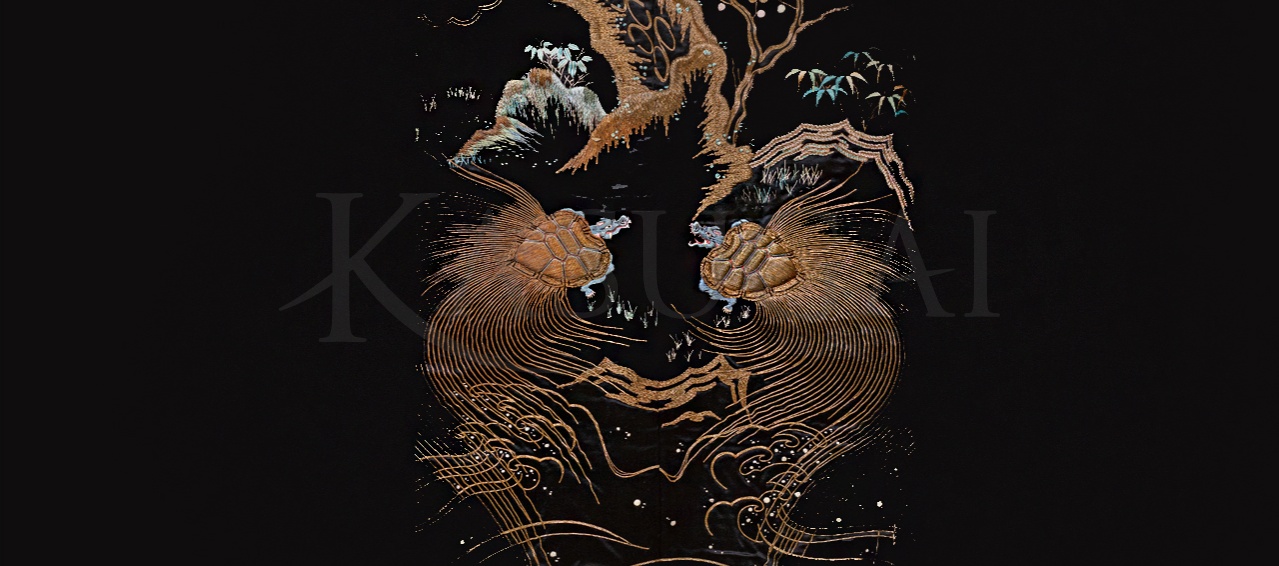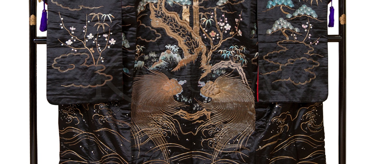 Кимоно расшито вручную золотыми нитями. Сюжет вышивки составляют традиционные для Японии, энергетически сильные образы, такие как сосна, бамбук, дерево сливы, журавли, а также мифические существа драконо-черепахи. Соединяя в себе мудрость черепахи и силу духа дракона, драконо-черепаха защищает от неудач и способствует жизненному успеху, это уникальный символ гармонии со Вселенной.