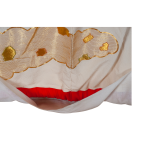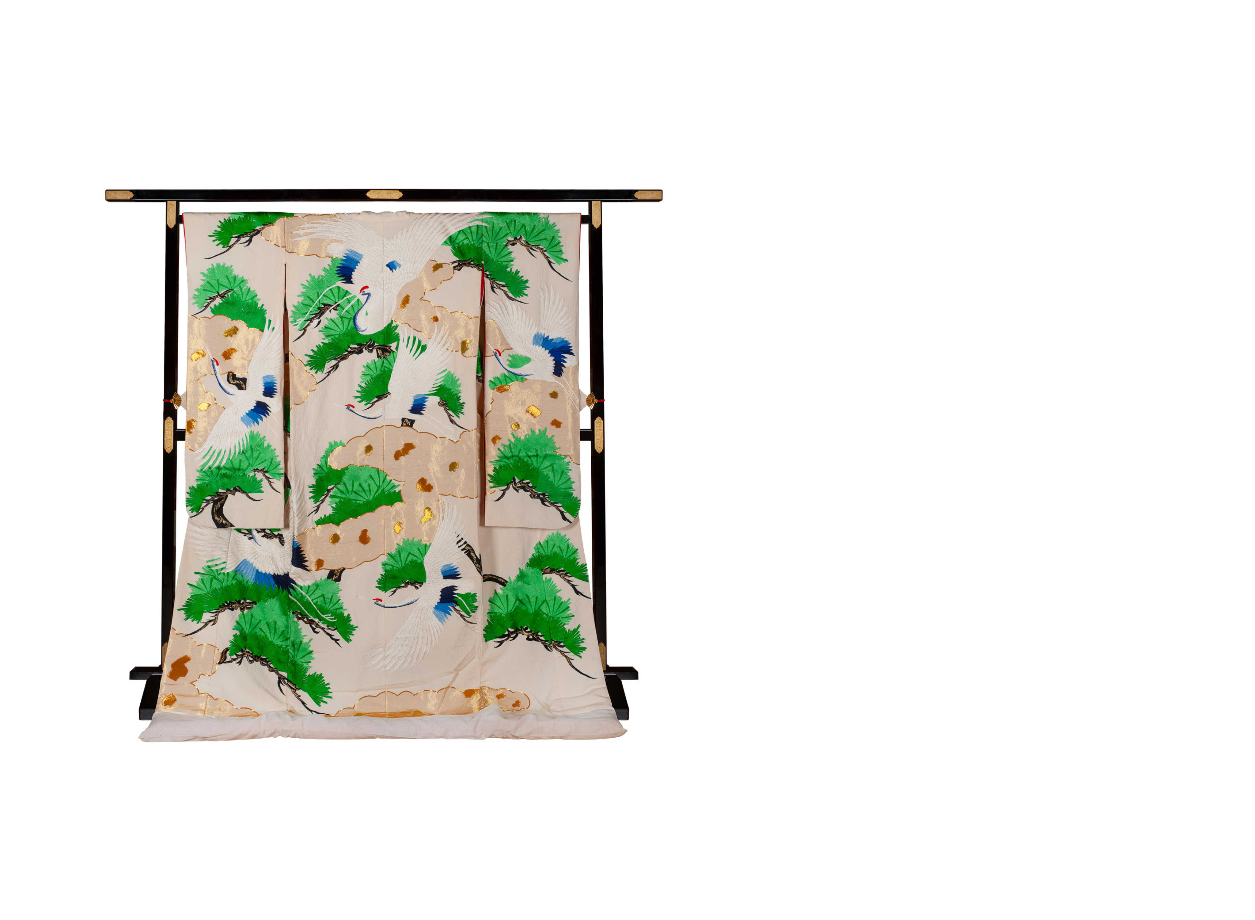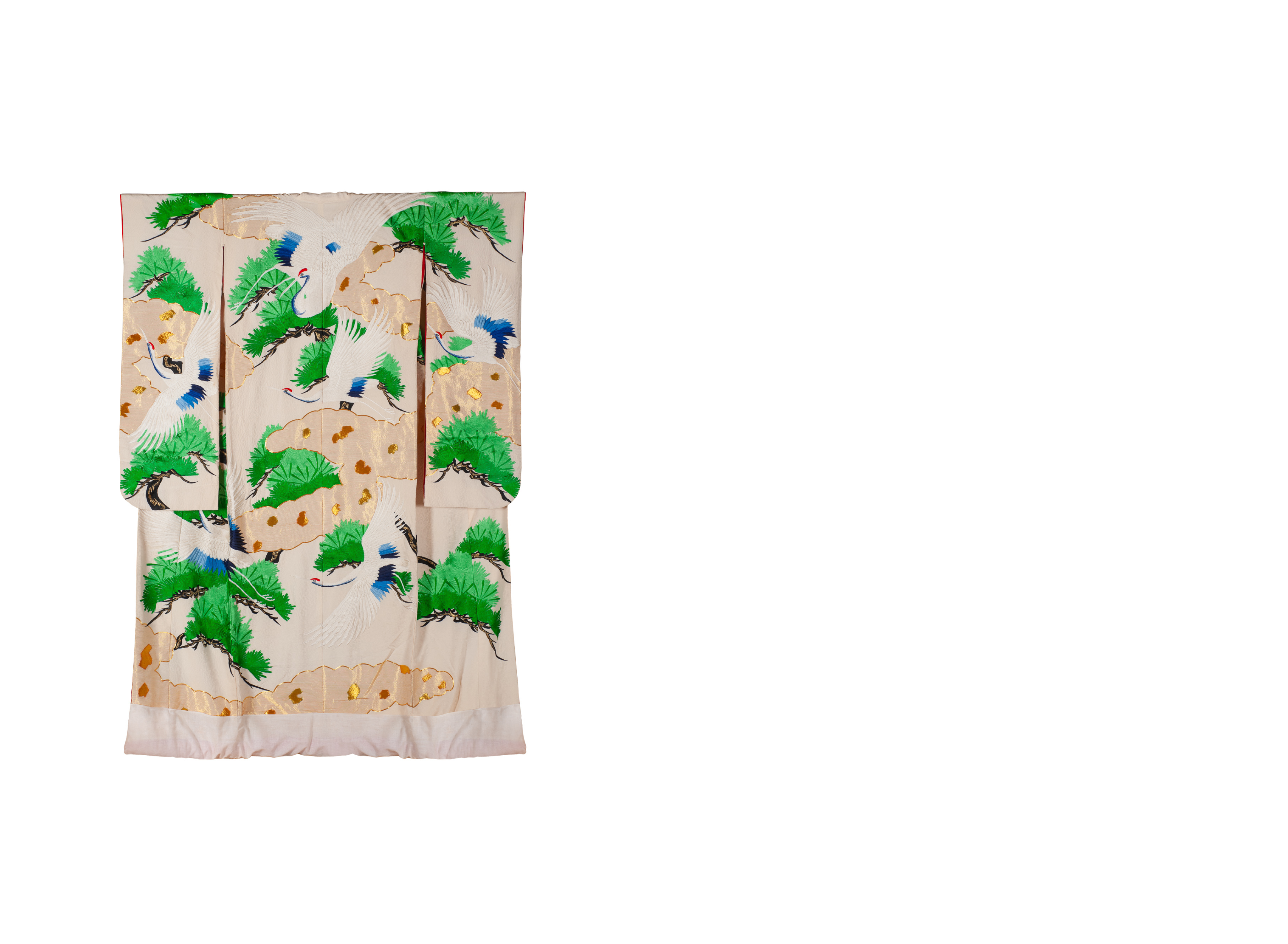 Традиционное японское свадебное кимоно утикакэ. Первые кимоно утикакэ носили женщины из богатых домов самурайских сословий в легендарные времена эпохи Муромати (1336 — 1573). Вариантом свадебного одеяние утикакэ стало в конце эпохи Эдо (1603-1868). Кимоно украшает образ журавля. Журавль — одна из самых благословенных птиц в Японии, символ долголетия, надежды, плодовитости, мира и семейного счастья, воплощение таких нравственных качеств, как мудрость, справедливость, благородство, интеллигентность, аристократизм. Подол кимоно утяжелен специальным валиком фуки. В качестве дополнительных аксессуаров для кимоно использованы лаковая вешалка и зажимы, стоимость которых рассчитывается отдельно.