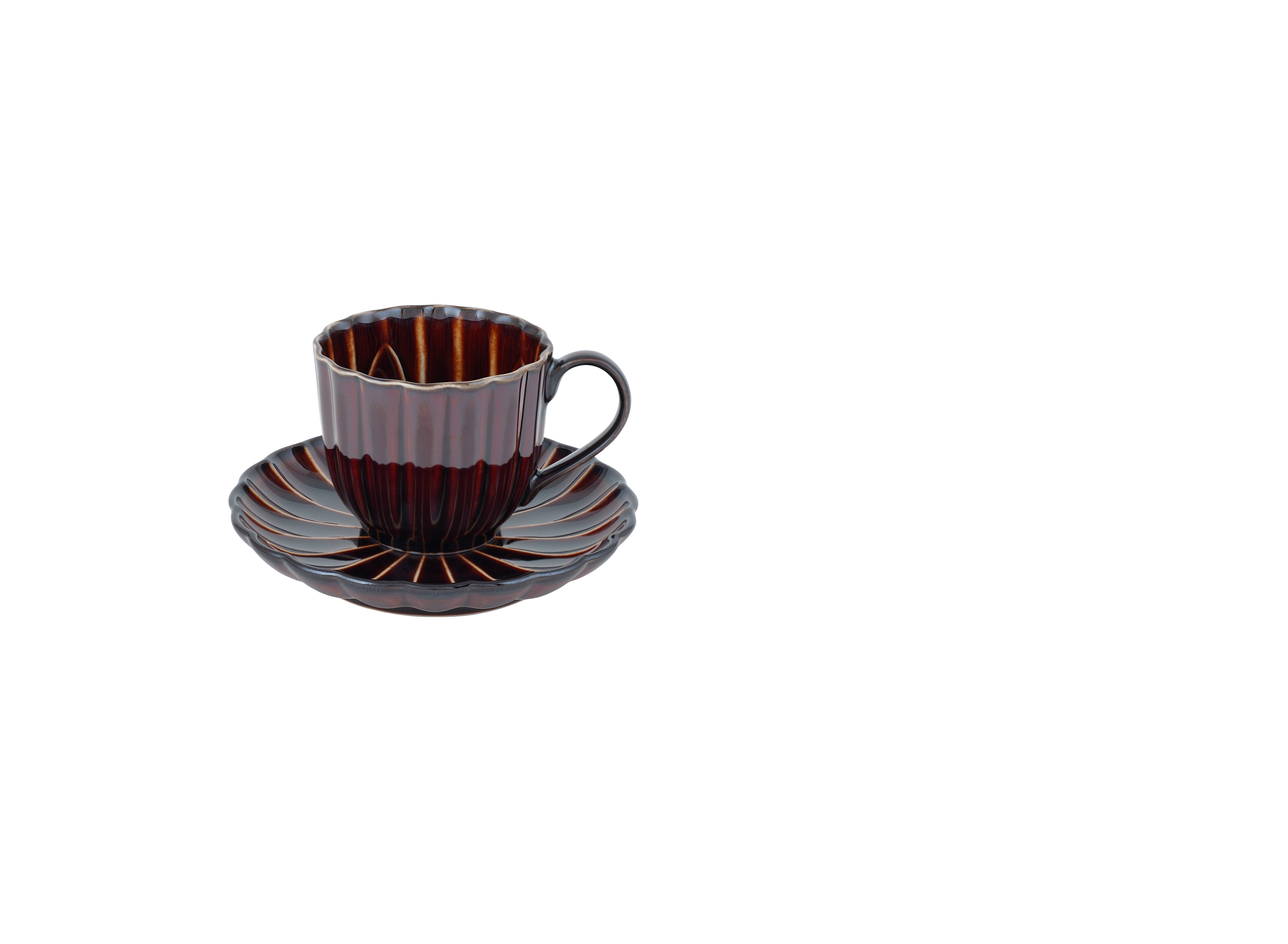 Предмет относится к одной из самых востребованных серий компании KANEKO KOHYO — «Гияман». «Гияман» — это заимствованное слово, появившееся в Японии в период Эдо (1603-1868), которым называли изделия из стекла с резным декором. Прототипом термина послужило голландское слово «diamant», что переводится как «бриллиант». Собственно, именно через голландских торговцев в эпоху Эдо резное стекло попало в Японию. В изделиях того времени было высокое содержание оксида свинца, что усиливало преломление света и стекло особенно красиво переливалось на солнце подобно бриллианту. Особенностью серии «Гияман» является специально разработанная сияющая глазурь, благодаря которой керамика становится похожей на стекло. Глазурь представлена в четырех узнаваемых оттенках: Айдзомэ (индиго-синий пигмент для крашения тканей), Рикю (темно-зеленый цвет чайной керамики Орибэ), Уруси (красновато-коричневый цвет японского лака), Суми (цвет черной туши традиционной живописи). Данная кофейная пара создана в оттенке японского лака уруси – теплый карамельный цвет дарит ощущение комфорта.