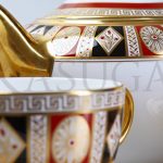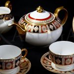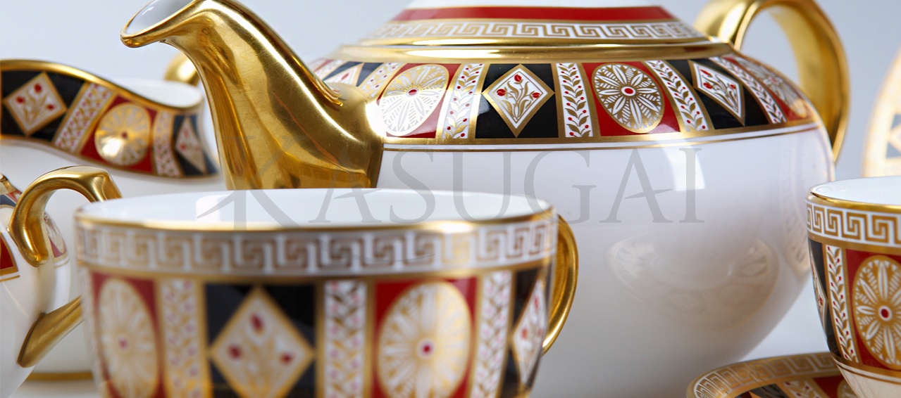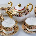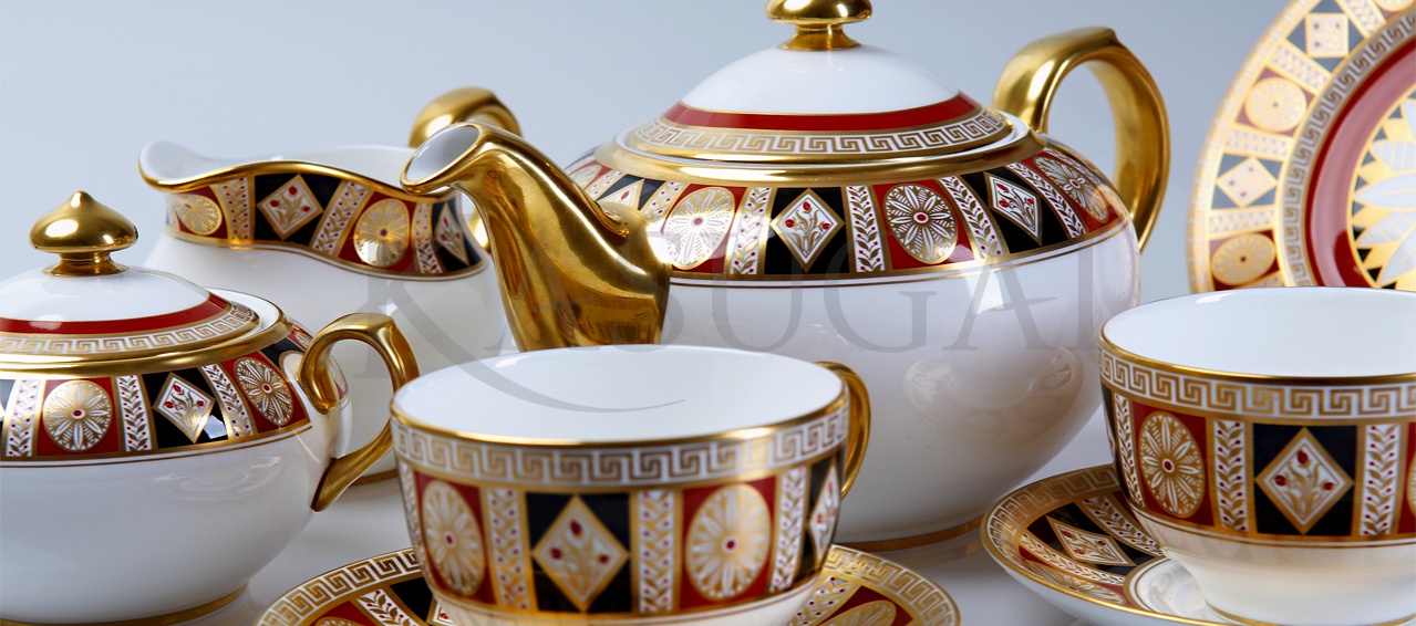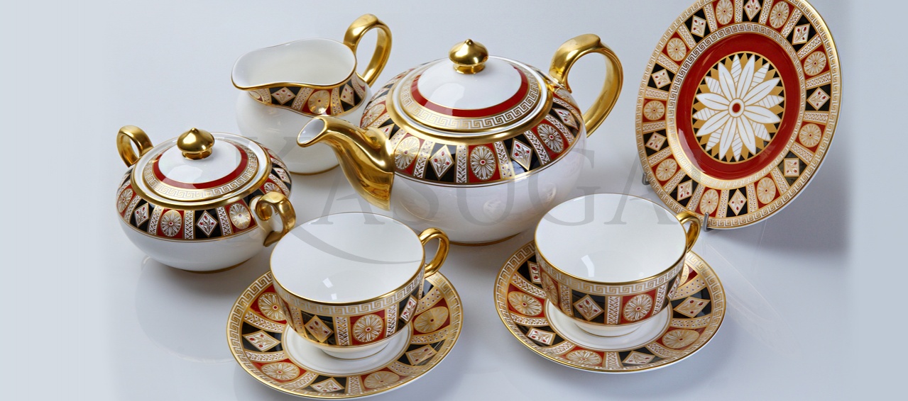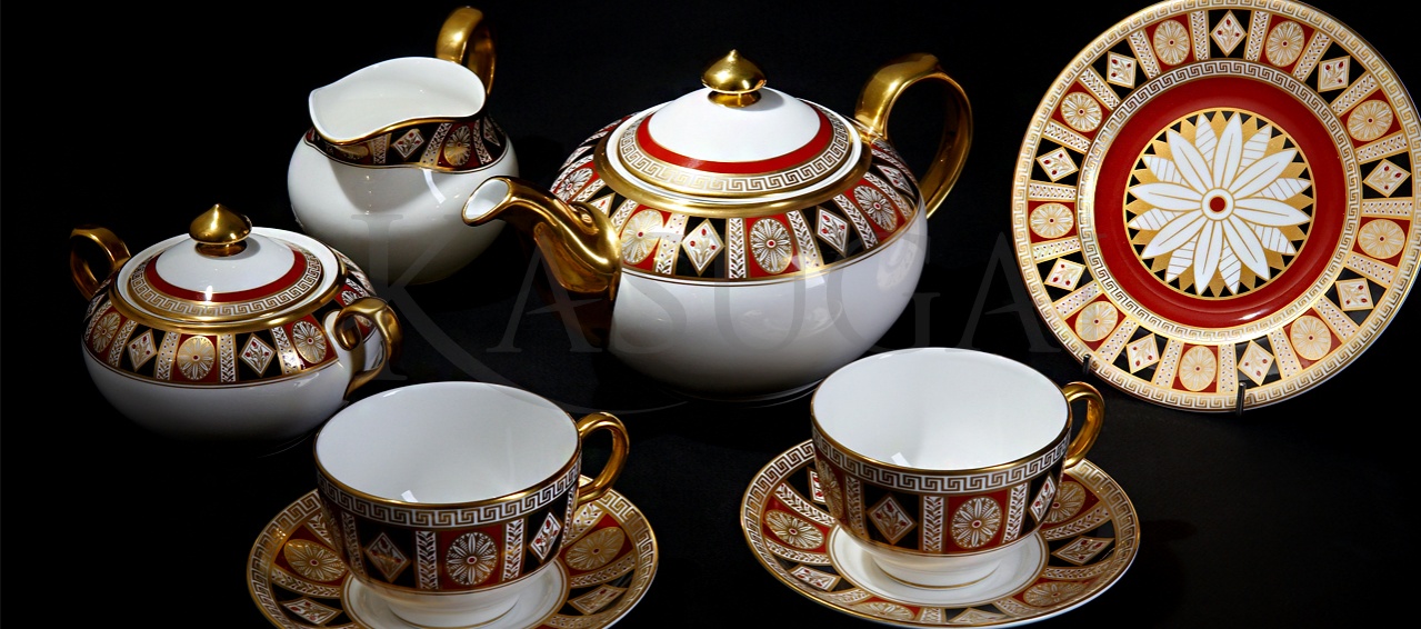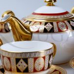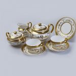 Сервиз выполнен из костяного фарфора и декорирован ручной росписью золотом и красками. Узоры росписи