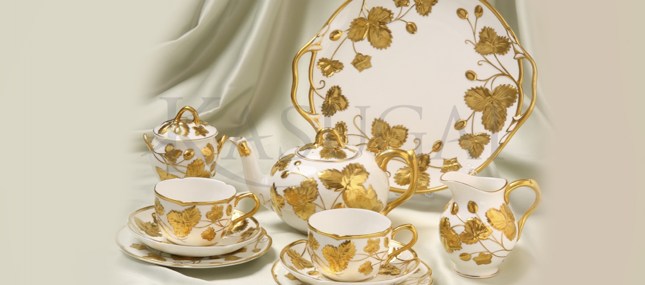 Сервиз выполнен из костяного фарфора и декорирован ручной надглазурной росписью золотом. Пышный декор сервиза представляет собой растительный мотив – листья