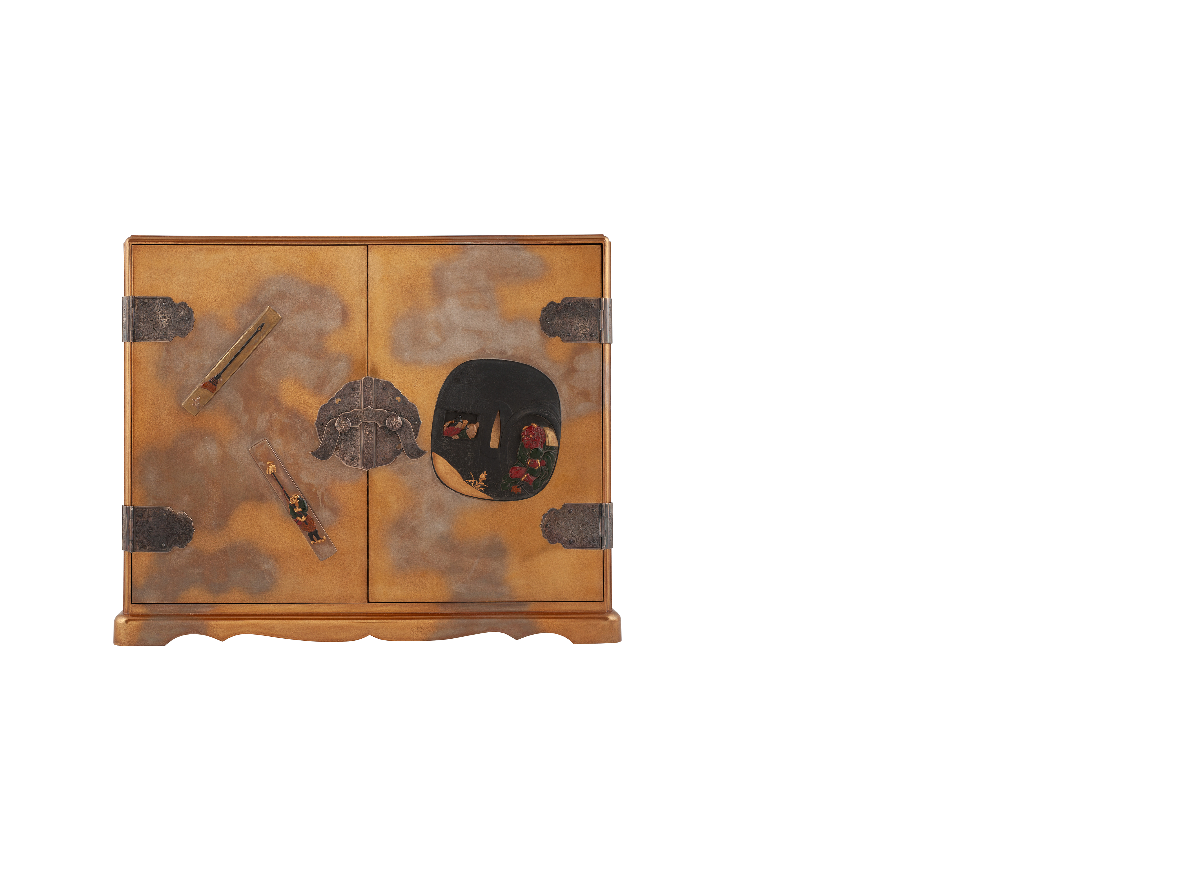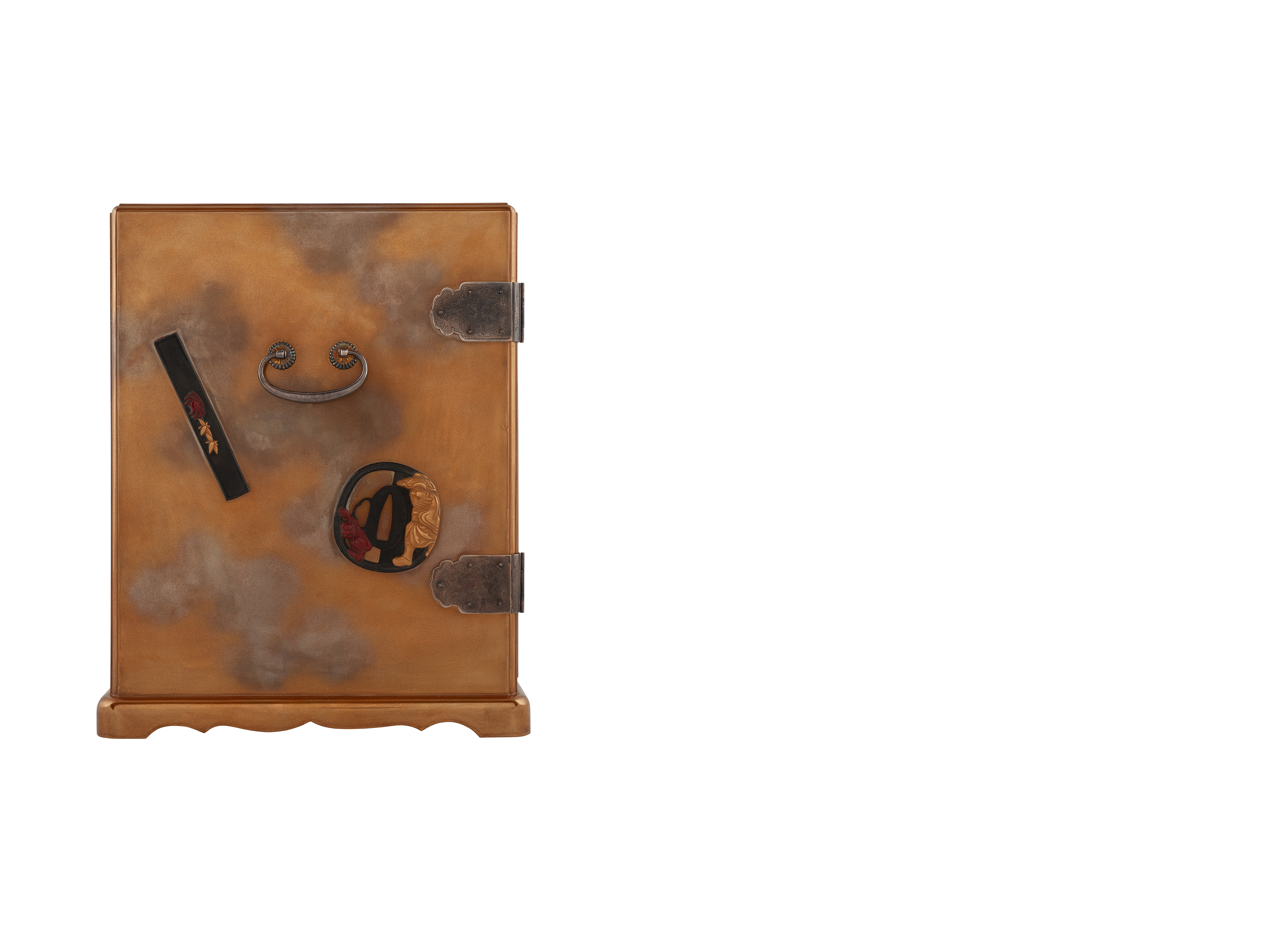 Комод состоит из 5 ярусов по 4 ячейки, в каждой из которых находится ложемент для инро и нэцкэ. Комод декорирован изображениями цуба, кодзука и инро. На каждом элементе представлен, выполненный в высоком рельефе, свой уникальный сюжет, отсылающий к известным легендам и мифам Японии. Высокое мастерство исполнения, трехмерность декора, причудливые сценки и персонажи притягивают внимание и приглашают к долгому разглядыванию деталей.