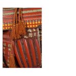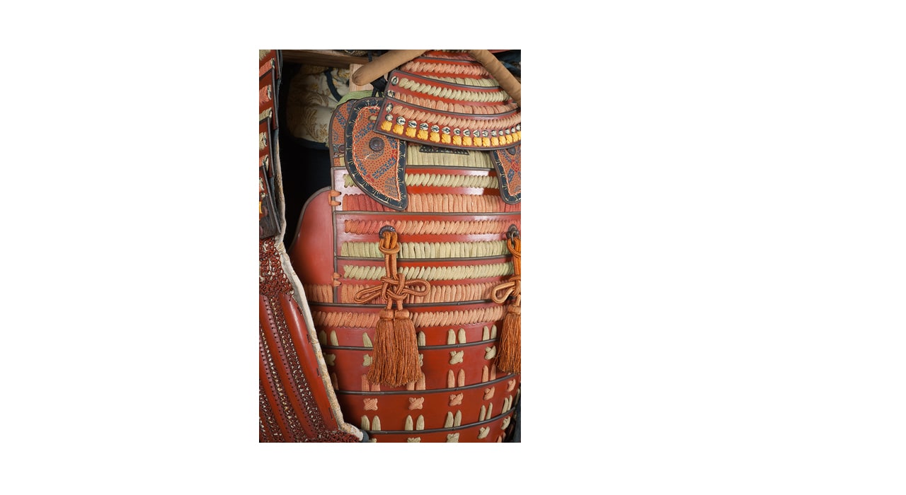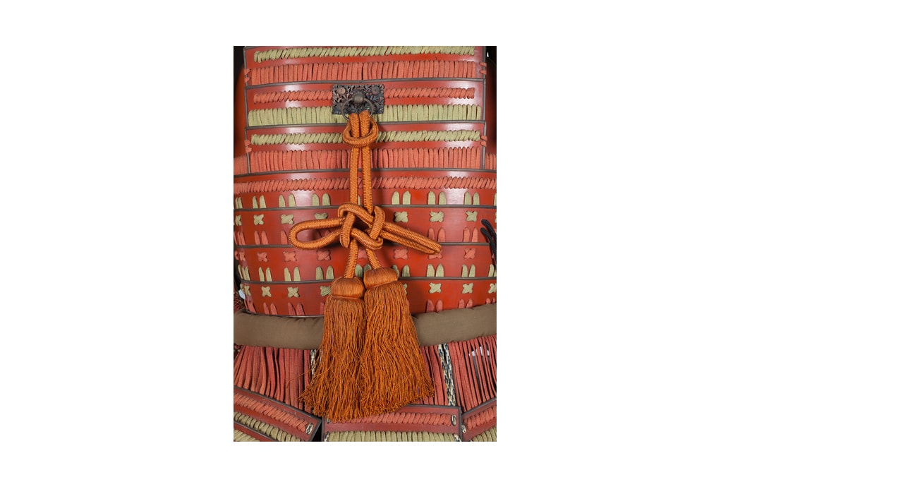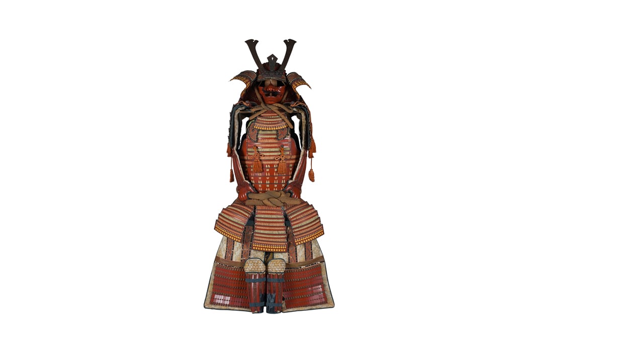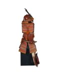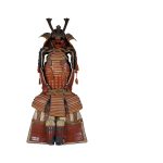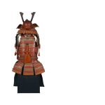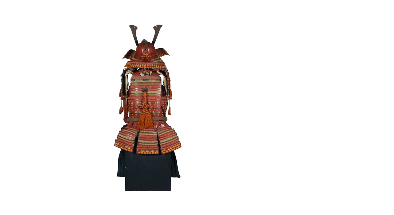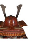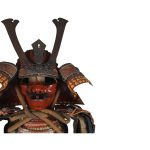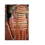 Данный комплект представляет собой детально выполненную современную декоративную реплику-имитацию самурайских доспехов тосэй-гусоку периода Адзути-Момояма (1568-1600) – Эдо (1600 – 1868) с отдельными антикварными деталями. Доминирующий цвет – киноварно-красный. Комплект современной работы состоит из стандартного набора составных частей доспеха тосэй-гусоку, формой и конструкцией полностью соответствующих историческим образцам; состоит из шлема хоси-кабуто с надшлемным украшением маэ-датэ в виде «рогов» кувагата со стилизованным мечом кэн в центре; подшлемной маской мэнгу (мэмпо) с пришнурованными к ней пластинами, защищающими горло; кирасы в стиле могами-до мунэ-атэ со шнуровкой в стиле сугакэ-одоси, со шнурами красного и светло-зеленого цвета; латной юбкой гэссэн и пояса ува-оби; двух оплечий осодэ; двух латных нарукавников в стиле сино-готэ; налядвенника хайдатэ и поножей сунэ-атэ. К комплекту прилагается сундук для хранения ёрои-бицу с иерглифом 前 маэ («находящийся впереди») на передней стенке. Большинство элементов доспеха выполнены во второй половине ХХ века из современных материалов, имитирующих традиционные: дюраль (вместо стали), искусственная кожа (вместо копченой оленьей кожи), бархатная бумага (вместо кожи эгава), современные синтетические пигменты вместо традиционного лака уруси и т.д. К антикварным деталям относятся некоторые декоративные детали канамоно (фигурные заклепки, кольца, резные металлические пластинки), а также черепаховые застежки кохадзэ. Для украшения отдельных частей доспеха используется декоративный узорчатый тканый шелк (парча) современной работы, а также шелковые шнуры с декоративными кистями (красного цвета). Данный комплект декоративных доспехов предназначен для украшения интерьеров.