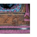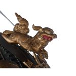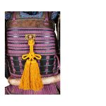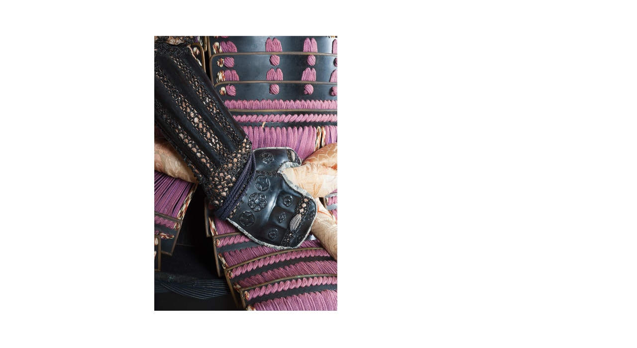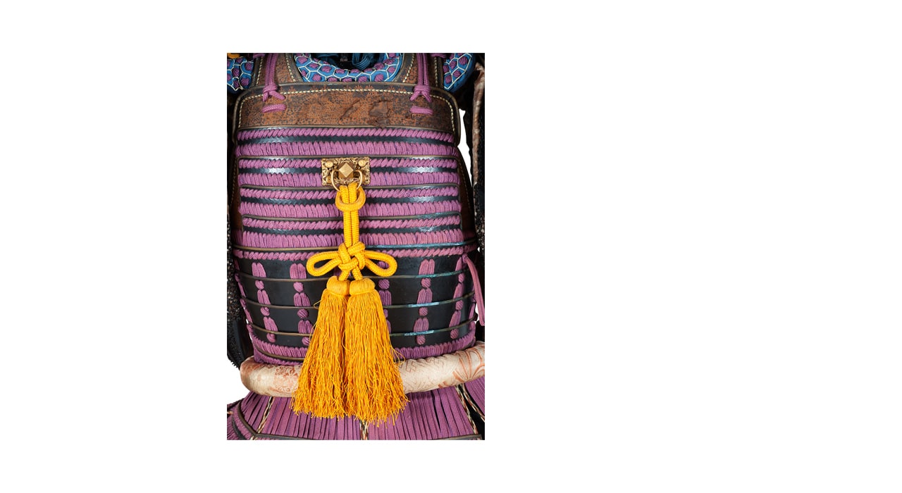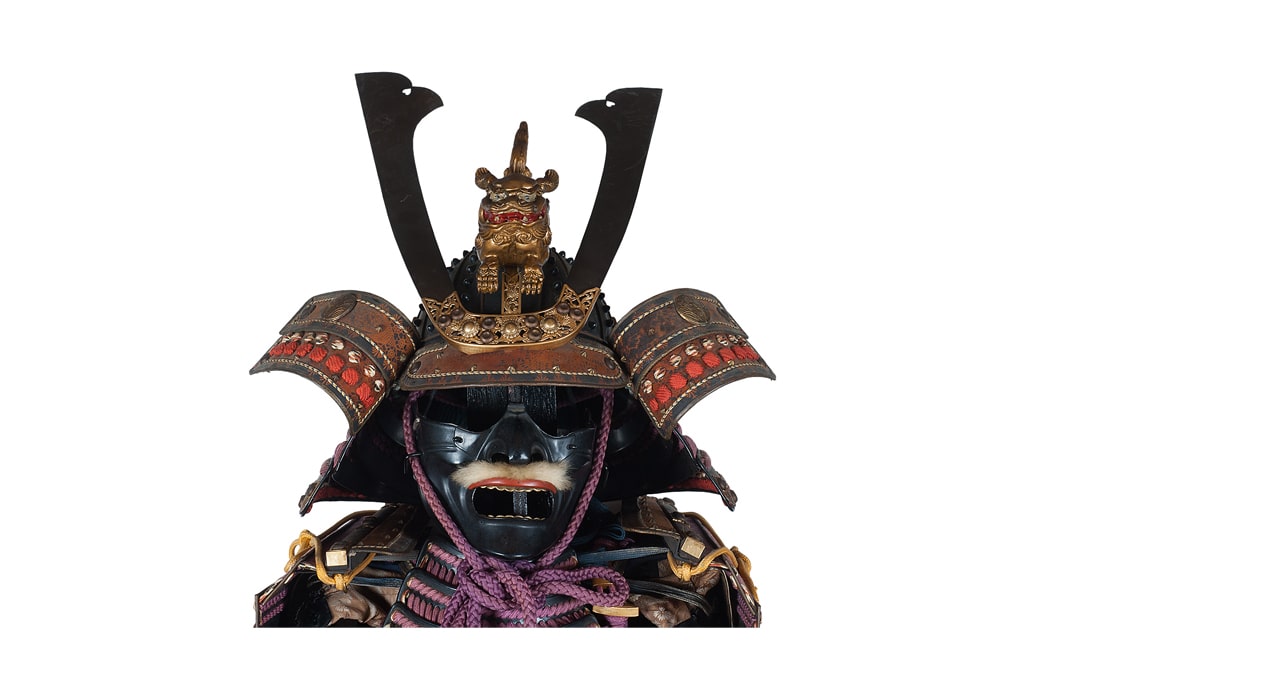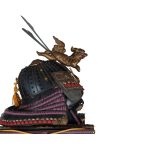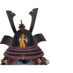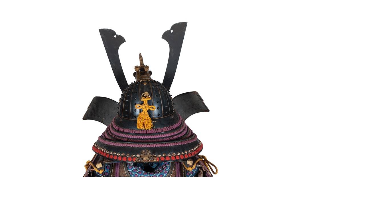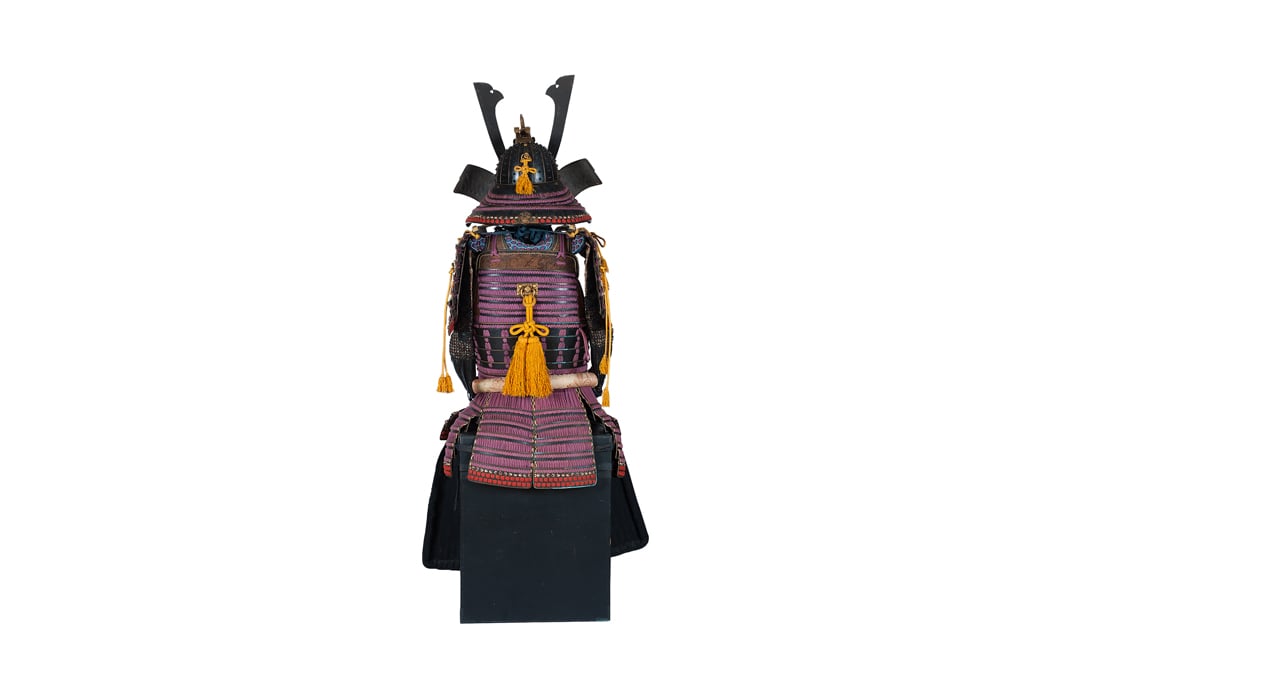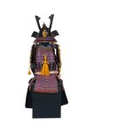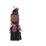 Данный комплект представляет собой детально выполненную современную декоративную реплику-имитацию самурайских доспехов тосэй-гусоку периода Адзути-Момояма (1568-1600) – Эдо (1600 – 1868) с отдельными антикварными деталями. Доминирующий цвет – черный и пурпурно-фиолетовый. Комплект включает в себя стандартный набор составных частей доспеха тосэй-гусоку, формой и конструкцией полностью соответствующих историческим образцам и состоит из шлема хоси-кабуто с надшлемным украшением маэ-датэ в виде «рогов» кувагата и нашлемным украшением ввиде фигурки «китайского льва» кара-сиси (литой пластик); подшлемной маски мэнгу (мэмпо) с пришнурованными к ней пластинами, защищающими горло; кирасы в стиле могами-до мунэ-атэ со шнуровкой в стиле сугакэ-одоси со шнурами цвета мурасаки (пурпурно-фиолетового); латной юбки гэссэн, пояса ува-оби; двух оплечий осодэ; двух латных нарукавников в стиле сино-готэ; налядвенника хайдатэ и поножей цубо-сунэ-атэ. К комплекту прилагается сундук для хранения ёрои-бицу с изображением герба даки-гёё抱杏 (двойной цветок абрикоса андзу, использовавшегося военными домами Отомо, Усуи, Набэсима и др). Большинство элементов доспеха выполнены во второй половине ХХ века из современных материалов, имитирующих традиционные: дюраль (вместо стали), искусственная кожа (вместо копченой оленьей кожи), бархатная бумага (вместо кожи эгава), современные синтетические пигменты вместо традиционного лака уруси и т.д. К антикварным деталям относятся некоторые металлические детали – в т.ч. металлические (сталь, лак) пластины и кольчужное плетение на наручах, металлические пластины (сталь, лак) с гербами ввиде пятиконечных звезд на налядвеннике хайдатэ, а также поножи цубо-сунэ-атэ (сталь, лак) – при этом текстильная оторочка поножей новодельная. Для украшения отдельных частей доспеха используется декоративный узорчатый тканый шелк (парча) современной работы, а также шелковые шнуры с декоративными кистями золотого цвета. Данный комплект декоративных доспехов предназначен для украшения интерьеров.