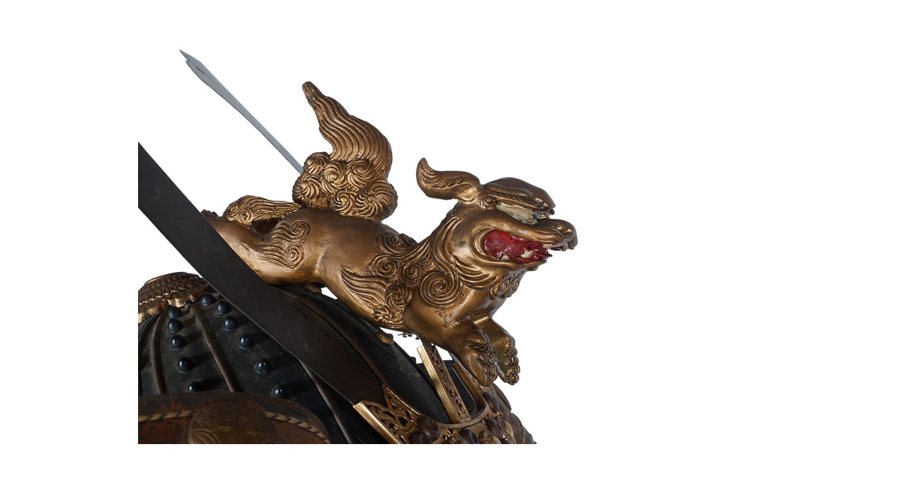 Комплект включает в себя стандартный набор составных частей доспеха тосэй-гусоку, формой и конструкцией полностью соответствующих историческим образцам и состоит из шлема хоси-кабуто с надшлемным украшением маэ-датэ в виде «рогов» кувагата и нашлемным украшением ввиде фигурки «китайского льва» кара-сиси (литой пластик); подшлемной маски мэнгу (мэмпо) с пришнурованными к ней пластинами, защищающими горло; кирасы в стиле могами-до мунэ-атэ со шнуровкой в стиле сугакэ-одоси со шнурами цвета мурасаки (пурпурно-фиолетового); латной юбки гэссэн, пояса ува-оби; двух оплечий осодэ; двух латных нарукавников в стиле сино-готэ; налядвенника хайдатэ и поножей цубо-сунэ-атэ. К комплекту прилагается сундук для хранения ёрои-бицу с изображением герба даки-гёё抱杏 (двойной цветок абрикоса андзу, использовавшегося военными домами Отомо, Усуи, Набэсима и др).